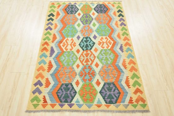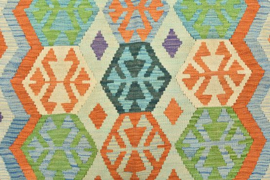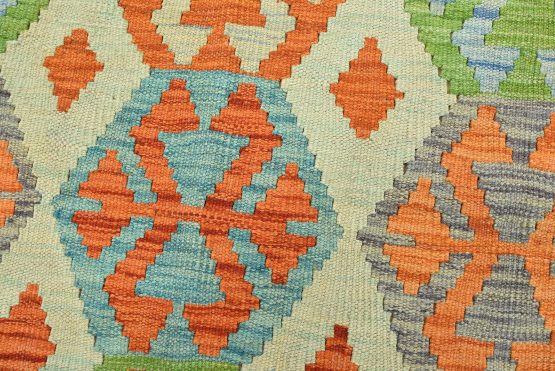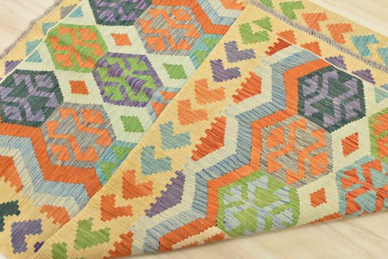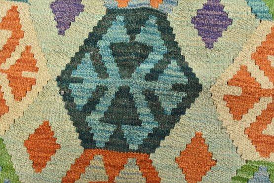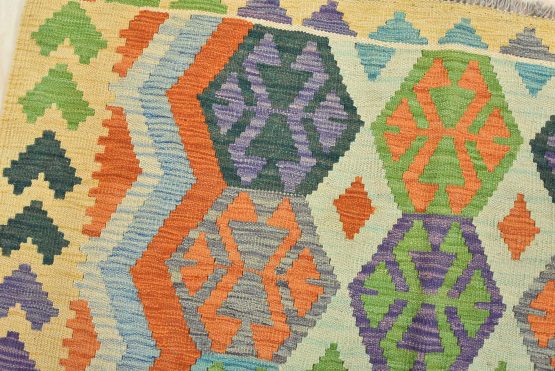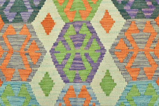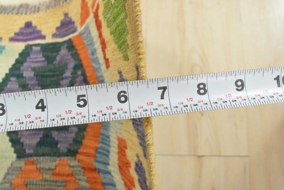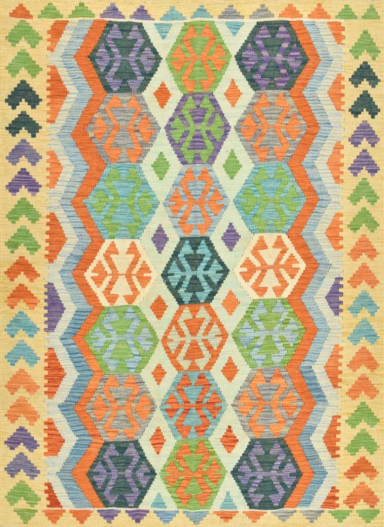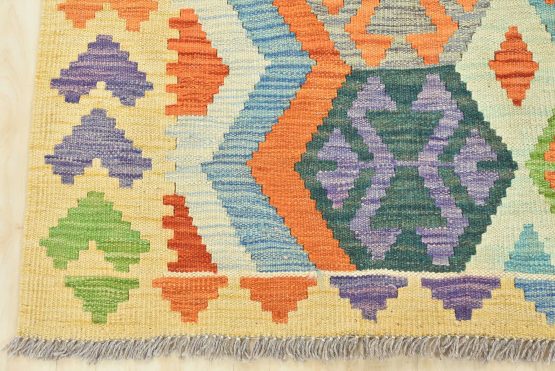For this reason, most Kilims can be classed as “slit woven” textiles. Collectors love the slits, as they produce very sharp-etched designs emphasizing the geometry of the weave. The weft strands, which carry the visible design and color, are almost always wool, whereas the hidden warp strands can be wool or cotton. The warp strands are only visible at the ends, where they emerge as the fringe. Whether laying it over furniture or on the floor, a Kilim will add a splash of color to any room.