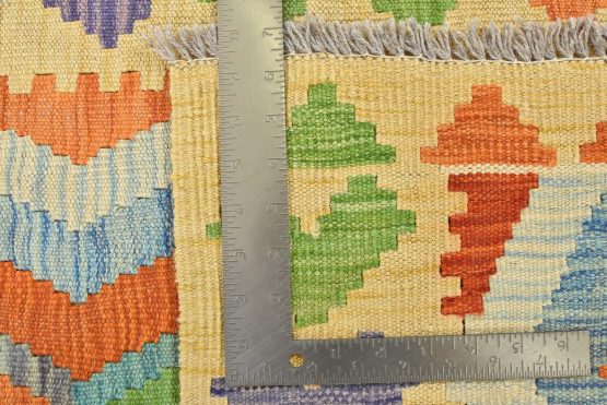 A tribal Kilim rug handwoven with fine wool on a wool foundation. This oriental rug features rows of geometric motifs. It is new and in excellent condition.