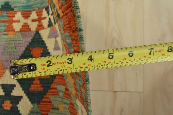 For this reason, most Kilims can be classed as “slit woven” textiles. Collectors love the slits, as they produce very sharp-etched designs emphasizing the geometry of the weave. The weft strands, which carry the visible design and color, are almost always wool, whereas the hidden warp strands can be wool or cotton. The warp strands are only visible at the ends, where they emerge as the fringe. Whether laying it over furniture or on the floor, a Kilim will add a splash of color to any room.