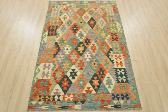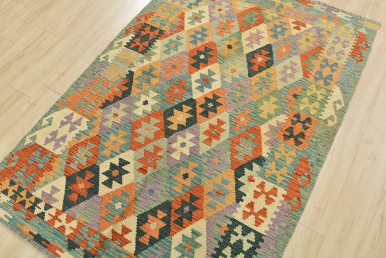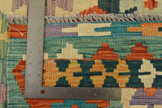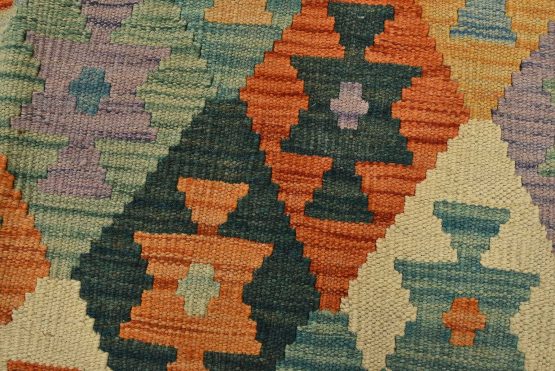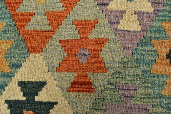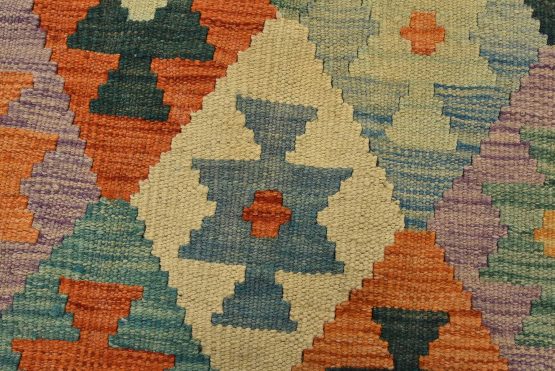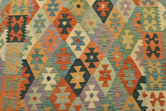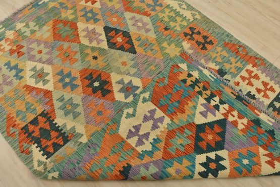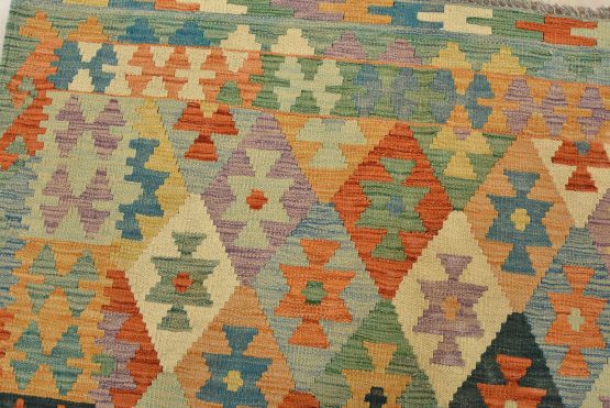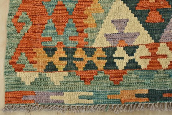 A tribal Kilim rug handwoven with fine wool on a wool foundation. This oriental rug features an all-over geometric pattern in multiple colors. It is new and in excellent condition.