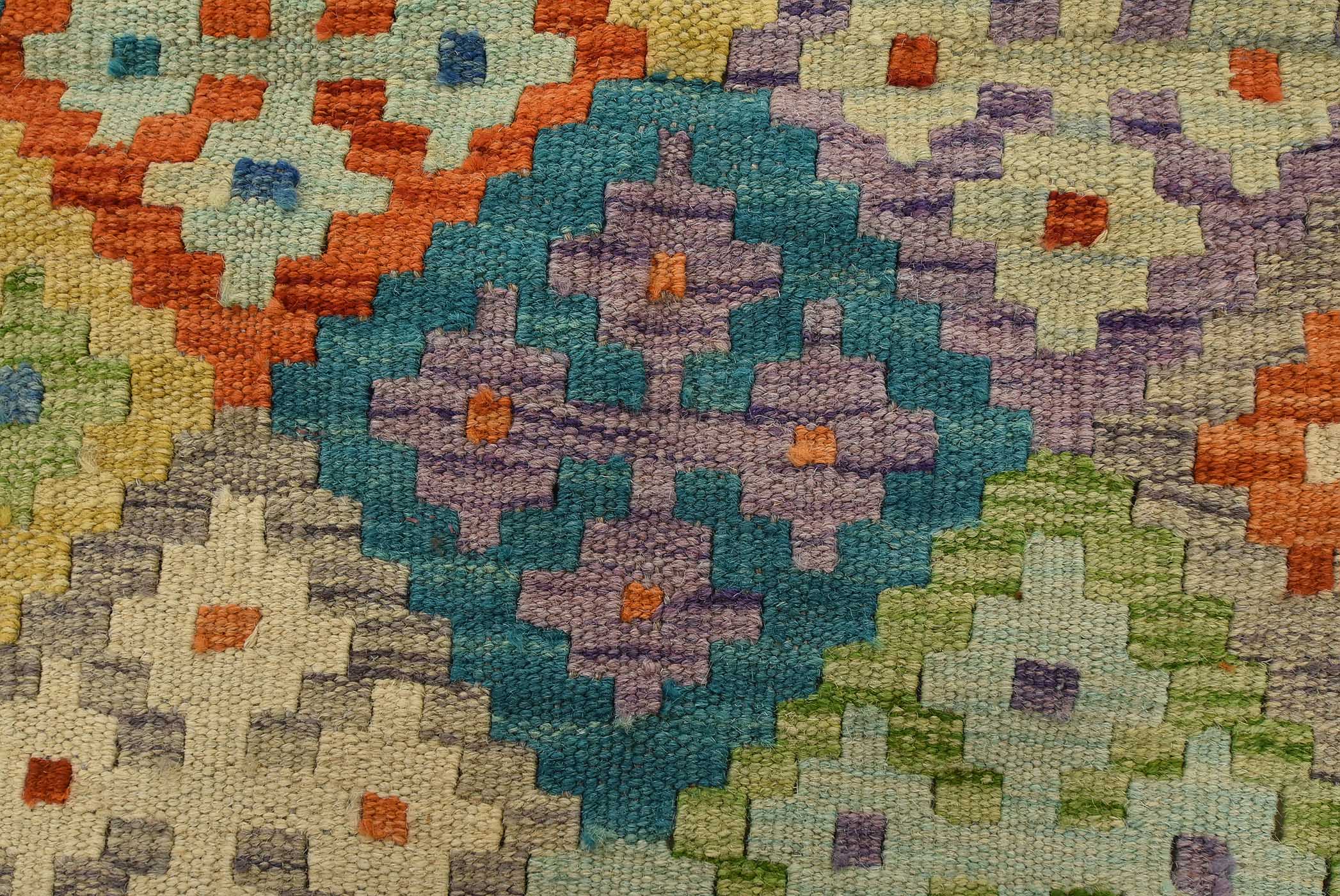 A tribal Kilim rug handwoven with fine wool on a wool foundation. This oriental rug features an all-over geometric pattern in multiple colors. It is new and in excellent condition.