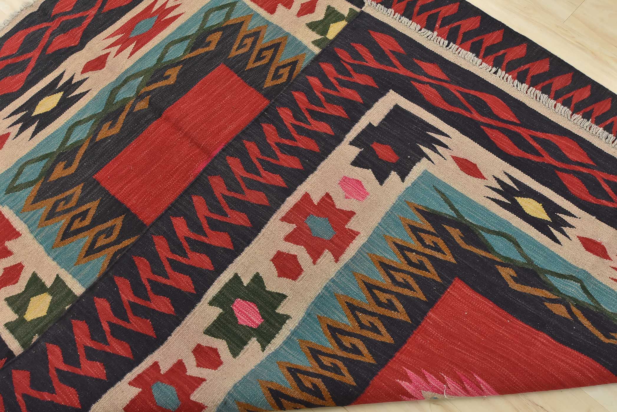A tribal Kilim rug handwoven with fine wool on a wool foundation. This oriental rug features geometric motifs set against a red background. It is new and in excellent condition.