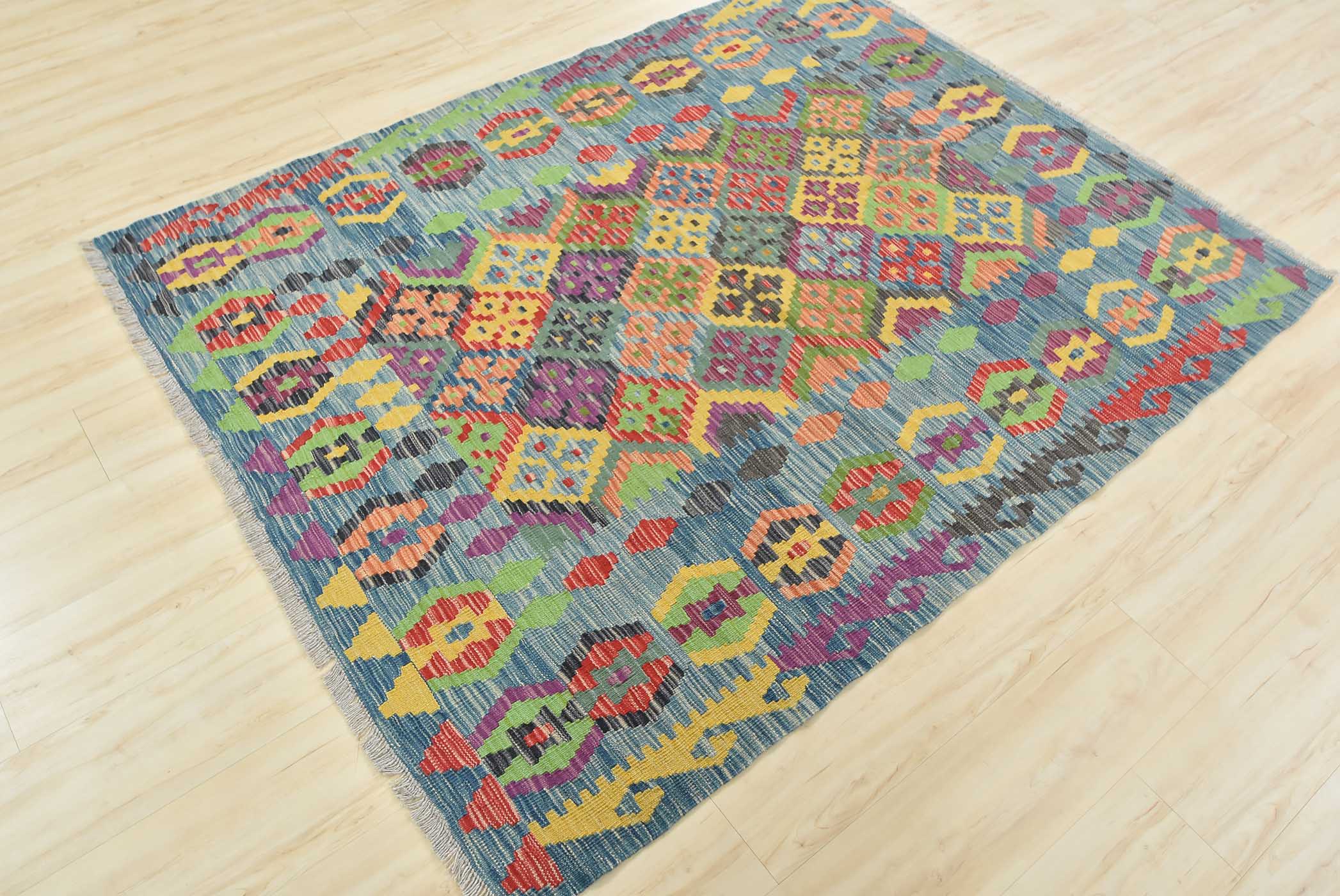 A tribal Kilim rug handwoven entirely from wool on a wool foundation. This oriental rug features an all-over geometric pattern in multiple colors. It is new and in excellent condition.