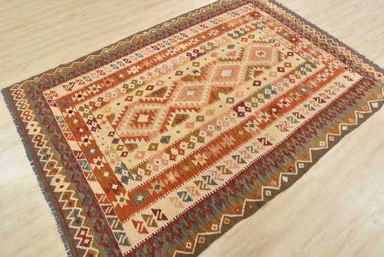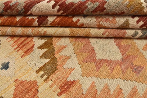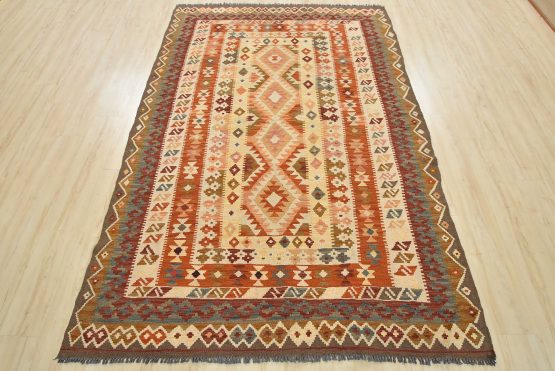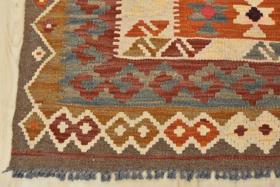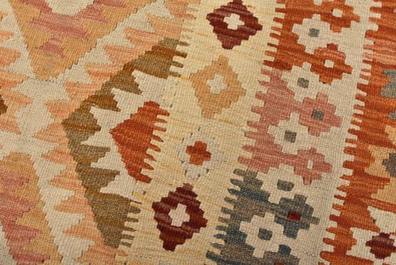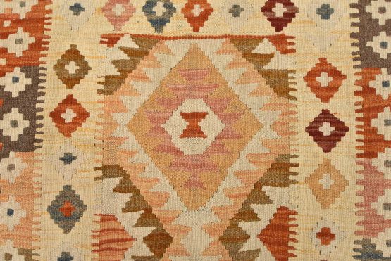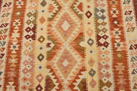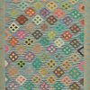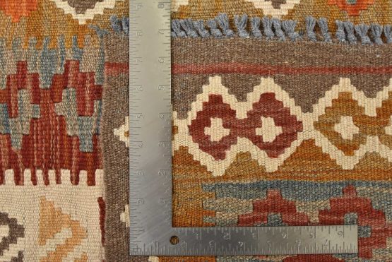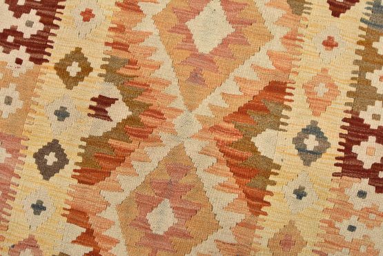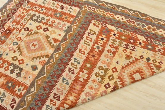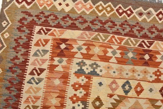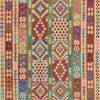 A tribal Kilim rug handwoven entirely from wool on a wool foundation. This oriental rug features an all-over geometric pattern in multiple colors. It is new and in excellent condition.