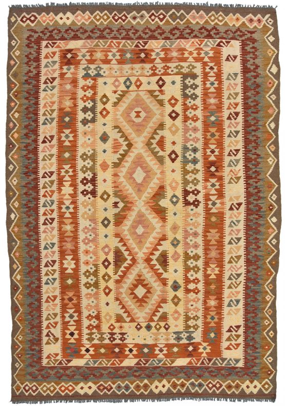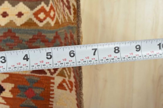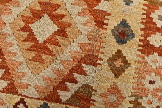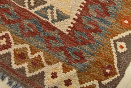 For this reason, most Kilims can be classed as “slit woven” textiles. Collectors love the slits, as they produce very sharp-etched designs emphasizing the geometry of the weave. The weft strands, which carry the visible design and color, are almost always wool, whereas the hidden warp strands can be wool or cotton. The warp strands are only visible at the ends, where they emerge as the fringe. Whether laying it over furniture or on the floor, a Kilim will add a splash of color to any room.
