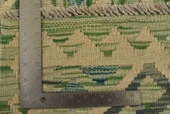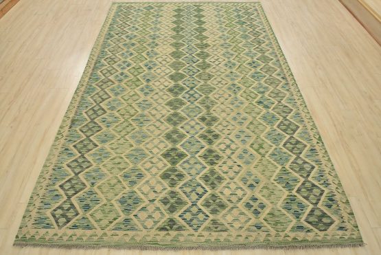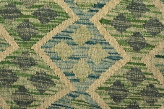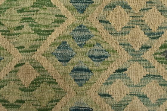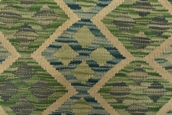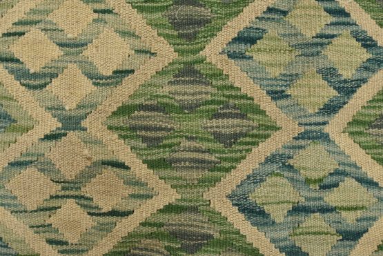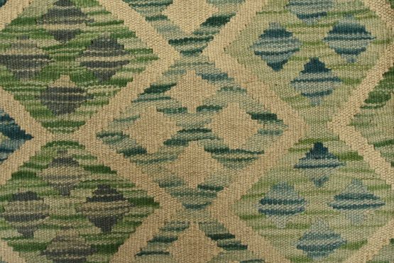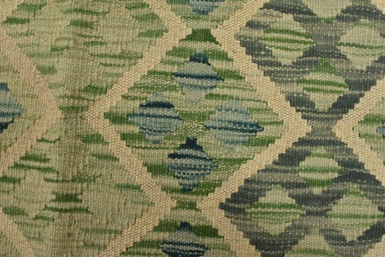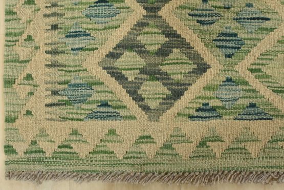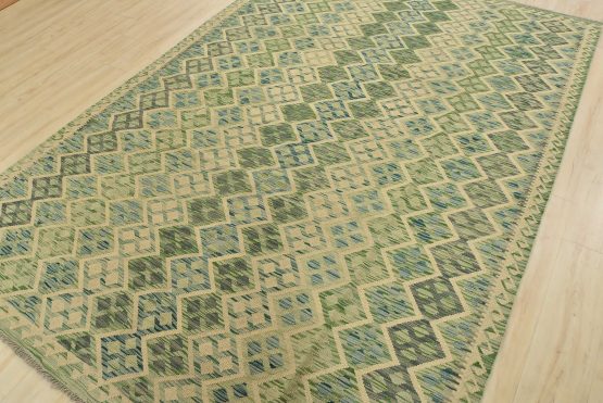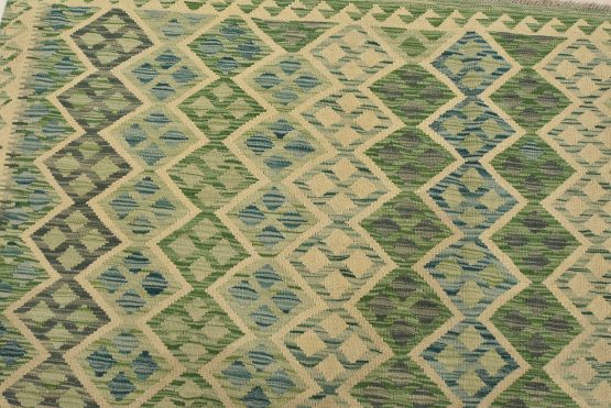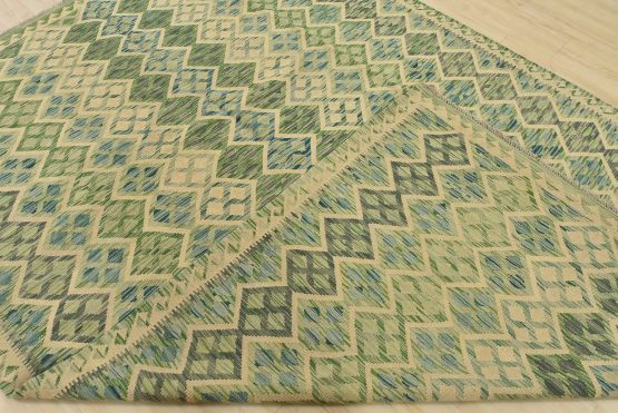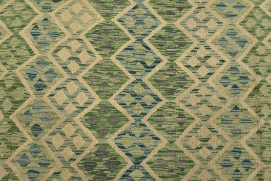 A tribal Kilim rug handwoven with all wool on a wool foundation. This oriental rug features an all-over geometric diamond-shaped pattern. It is new and in excellent condition.