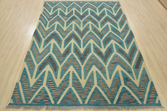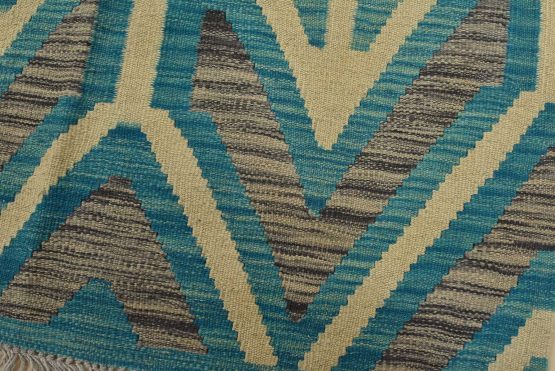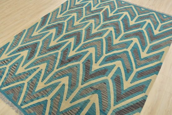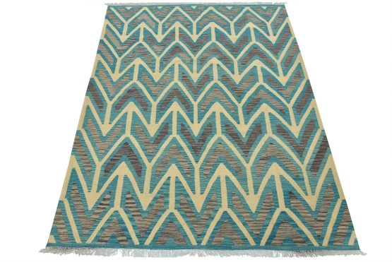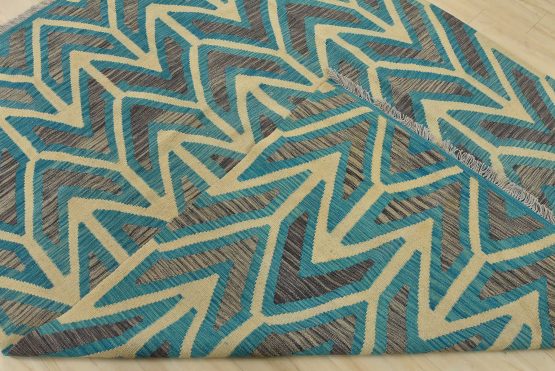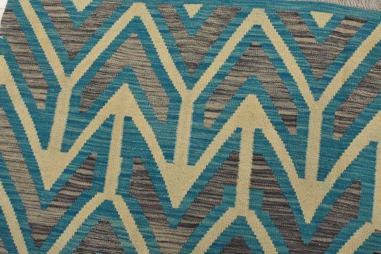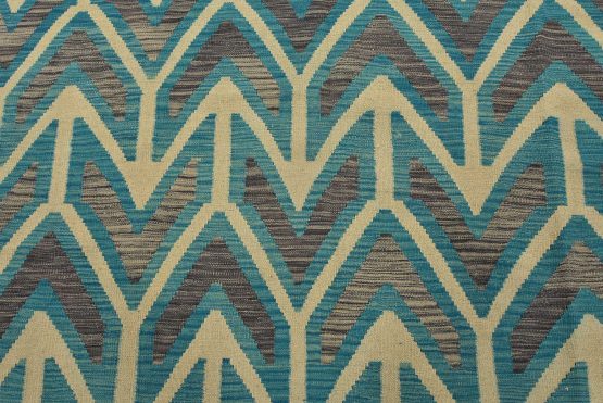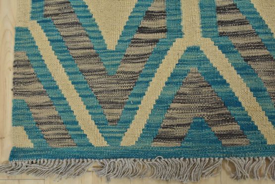 A modern Kilim rug handwoven entirely from wool with a wool foundation. The rug features an all-over pattern of geometric arrows. It is new and in excellent condition.