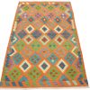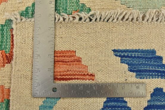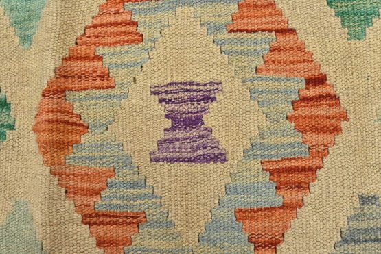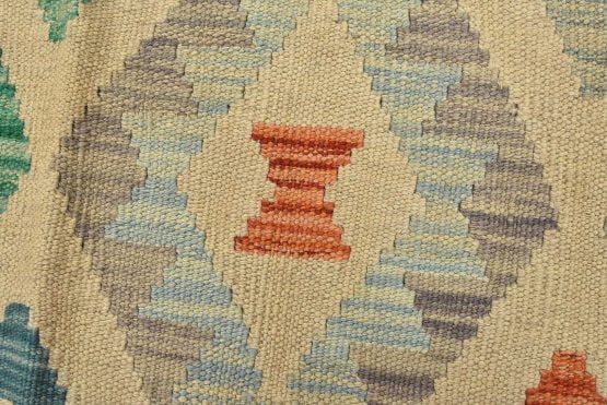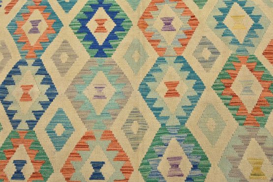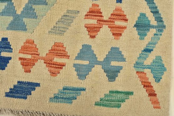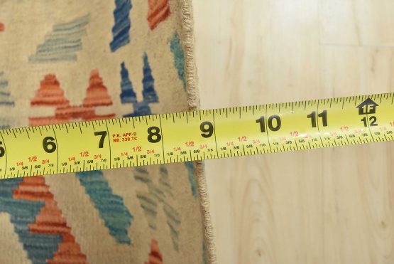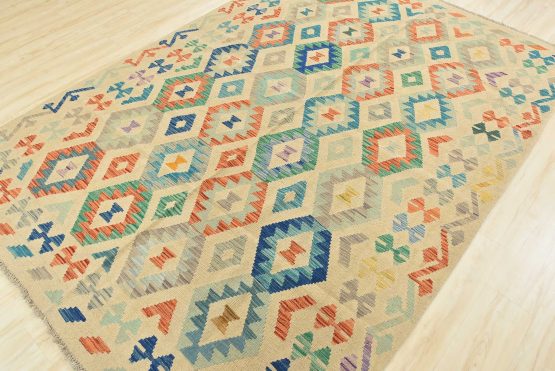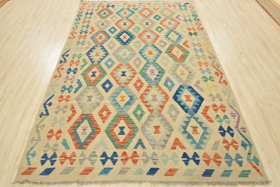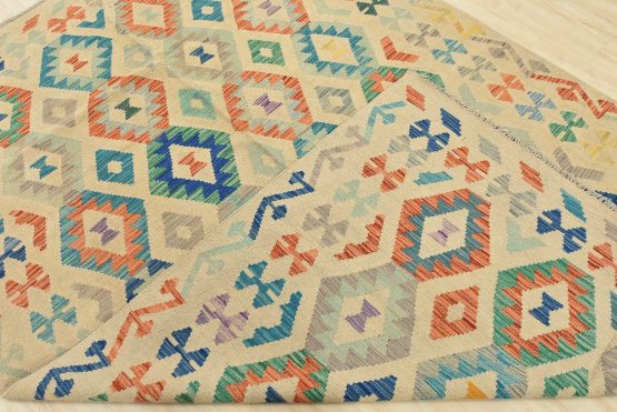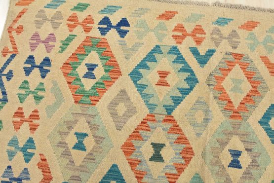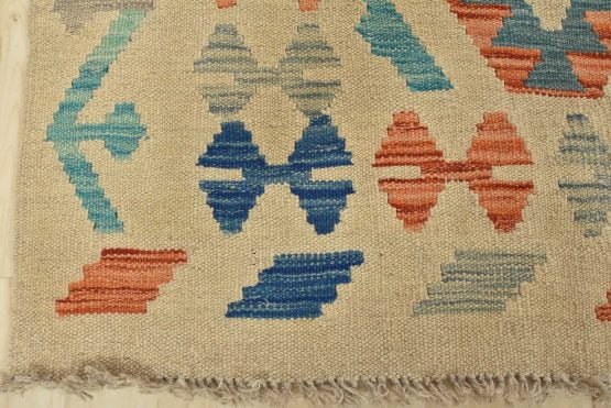A tribal Kilim rug handwoven with fine wool on a wool foundation. This oriental rug features a geometric pattern set against a beige background. It is new and in excellent condition.