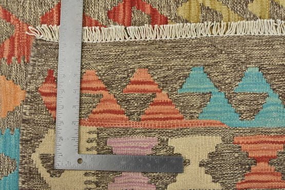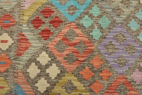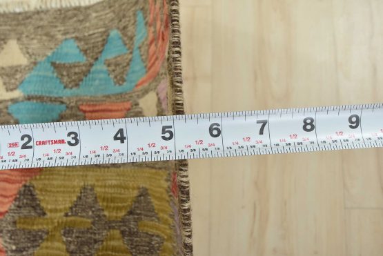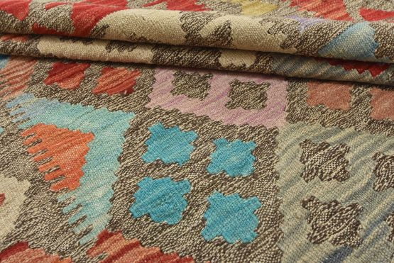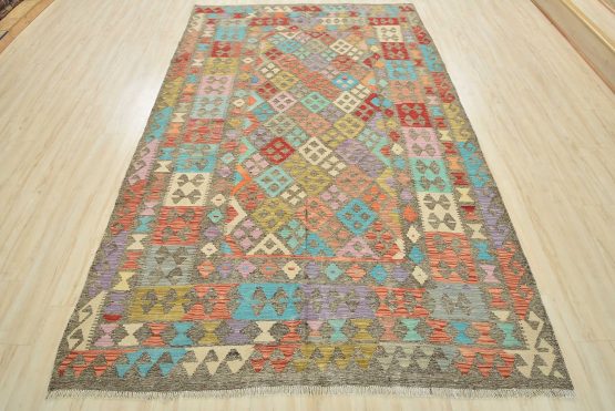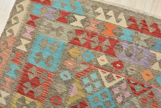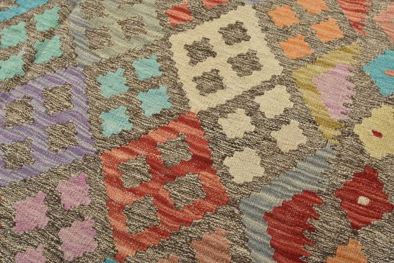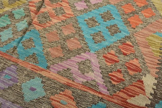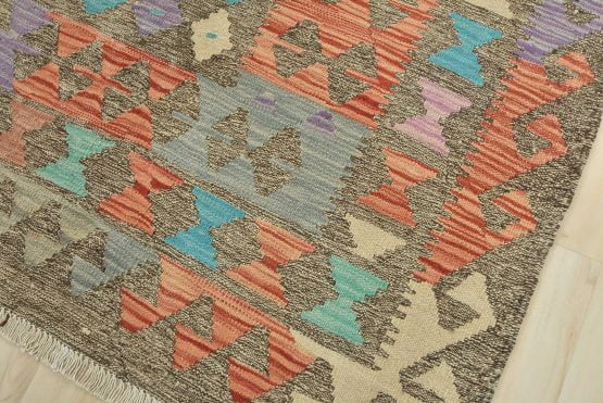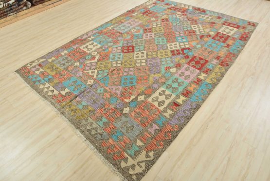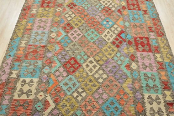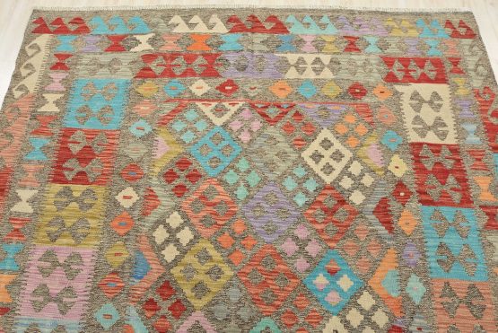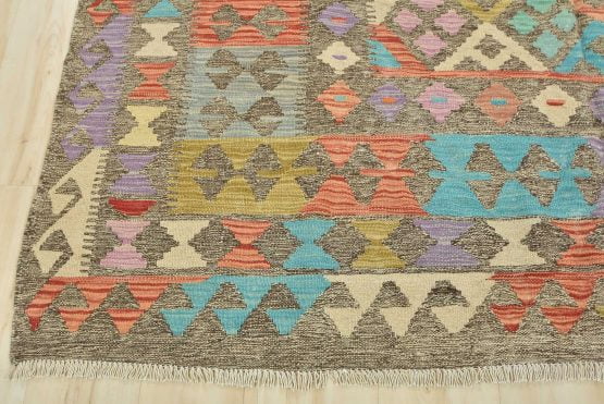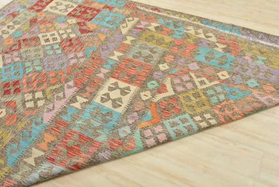 A tribal Kilim rug handwoven with fine wool on a cotton foundation. This oriental rug features an all-over geometric pattern in multiple colors. It is new and in excellent condition.