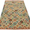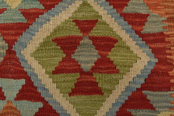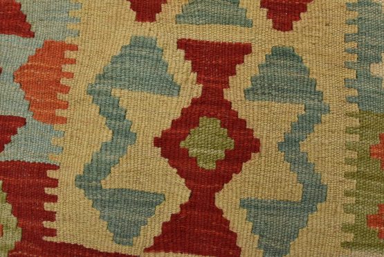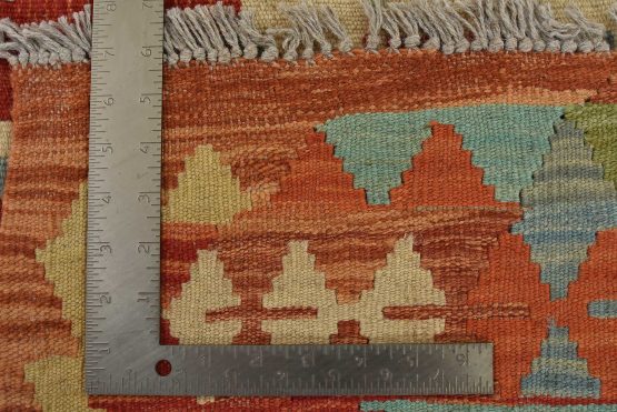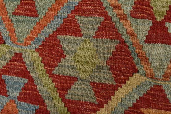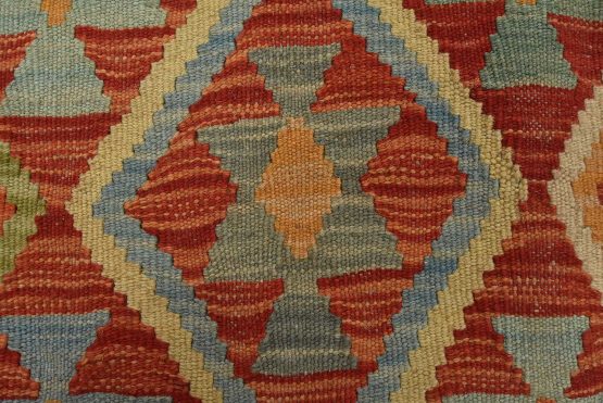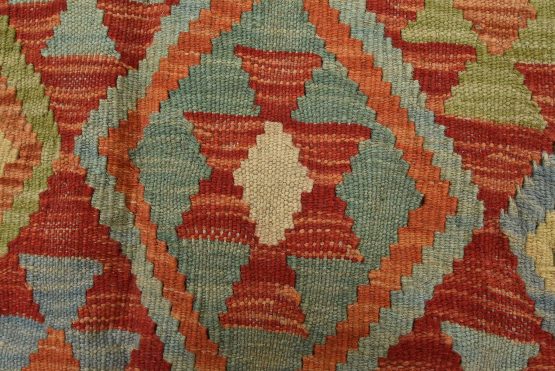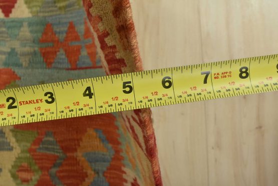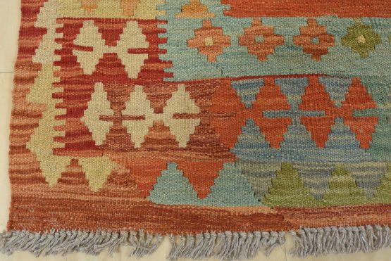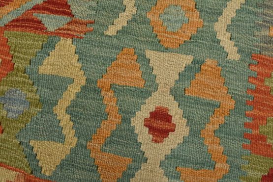 For this reason, most Kilims can be classed as “slit woven” textiles. Collectors love the slits, as they produce very sharp-etched designs emphasizing the geometry of the weave. The weft strands, which carry the visible design and color, are almost always wool, whereas the hidden warp strands can be wool or cotton. The warp strands are only visible at the ends, where they emerge as the fringe. Whether laying it over furniture or on the floor, a Kilim will add a splash of color to any room.