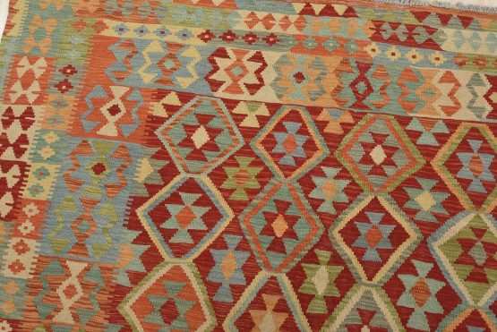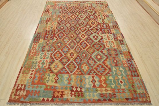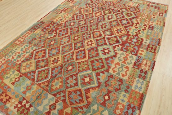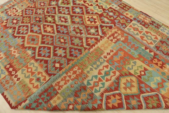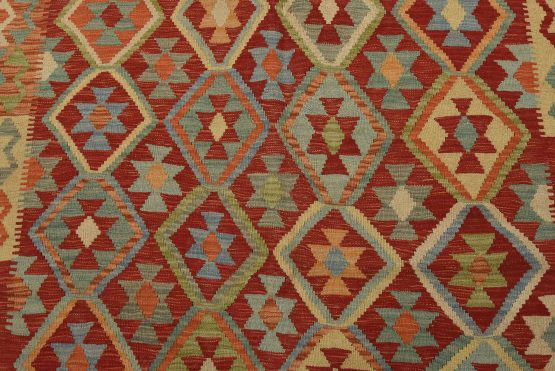 A tribal Kilim rug handwoven with all wool on a wool foundation. This oriental rug features an all-over geometric pattern set against a red background. It is new and in excellent condition.