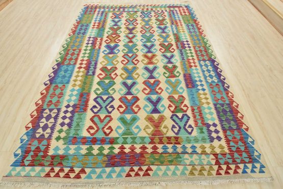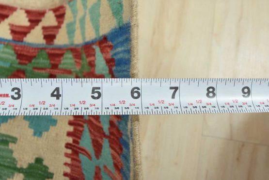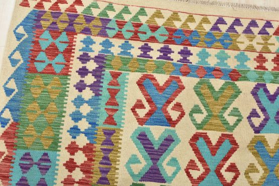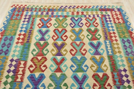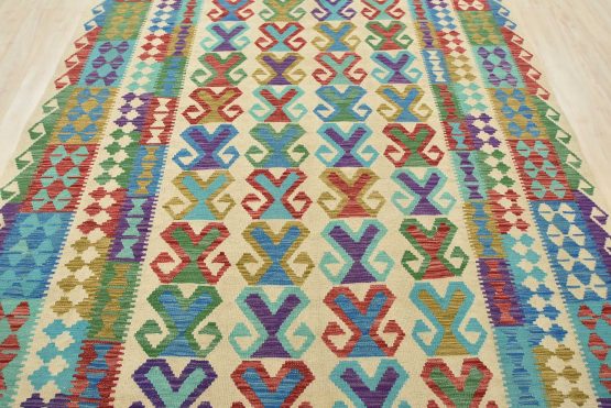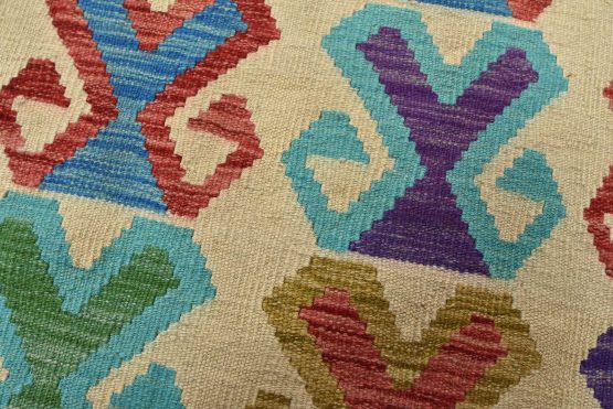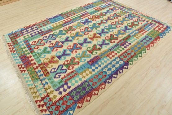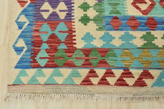 A tribal Kilim rug handwoven with wool on a cotton foundation. This oriental rug features a geometric pattern set against a beige background. It is new and in excellent condition.