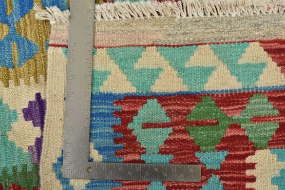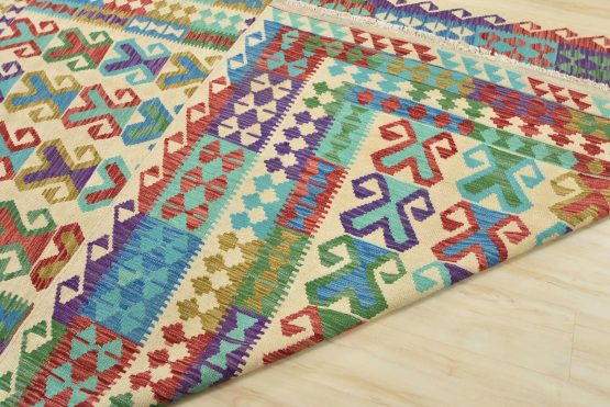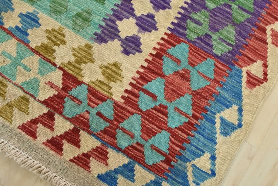For this reason, most Kilims can be classed as “slit woven” textiles. Collectors love the slits, as they produce very sharp-etched designs emphasizing the geometry of the weave. The weft strands, which carry the visible design and color, are almost always wool, whereas the hidden warp strands can be wool or cotton. The warp strands are only visible at the ends, where they emerge as the fringe. Whether laying it over furniture or on the floor, a Kilim will add a splash of color to any room.