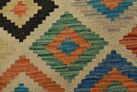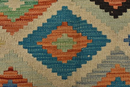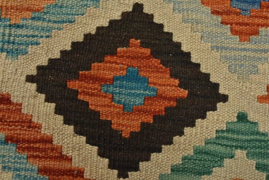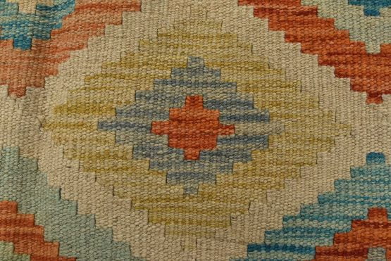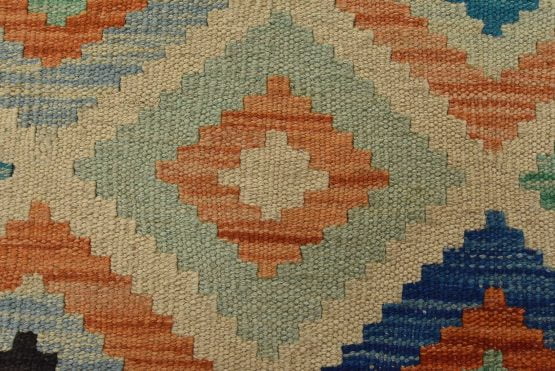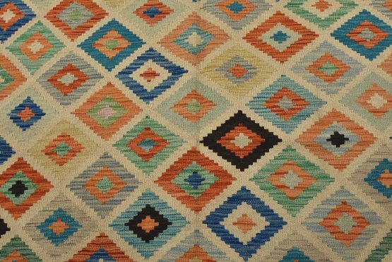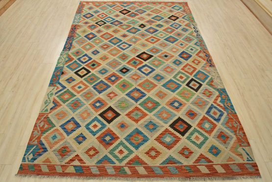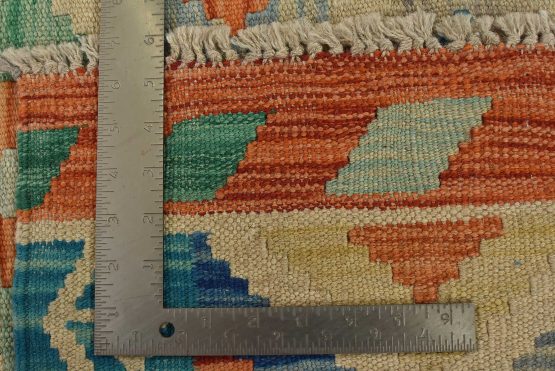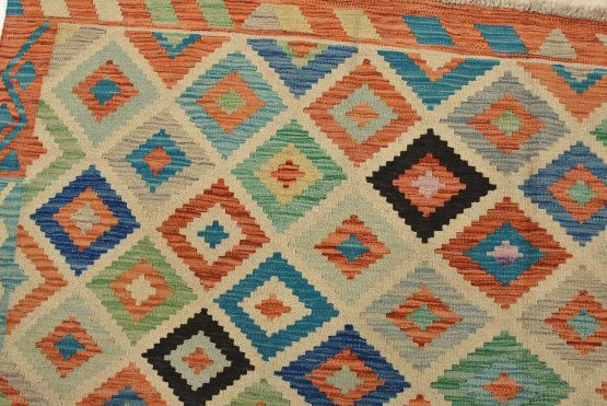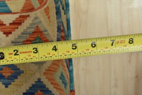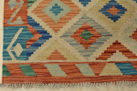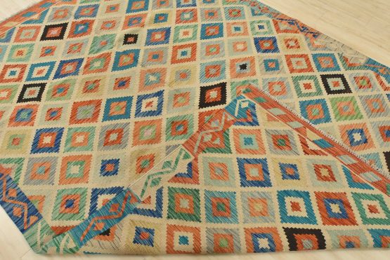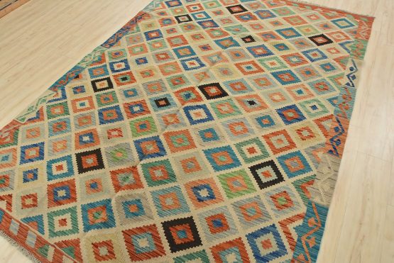 A tribal Kilim rug handwoven with fine wool on a wool foundation. This oriental rug features a geometric pattern in multiple colors. It is new and in excellent condition.