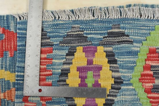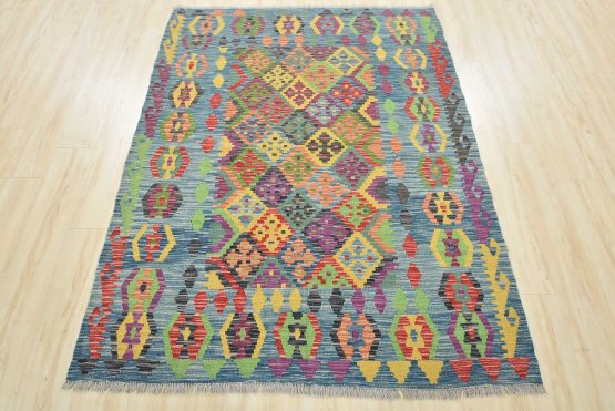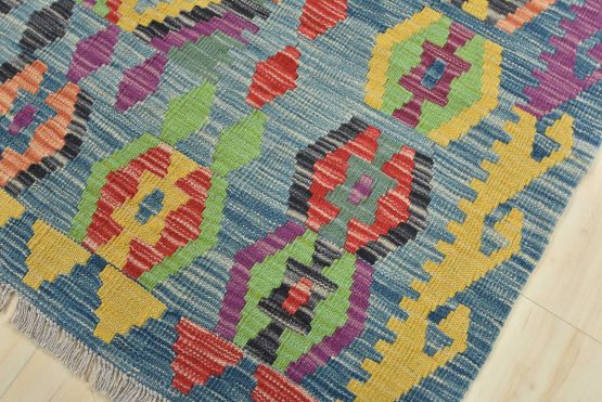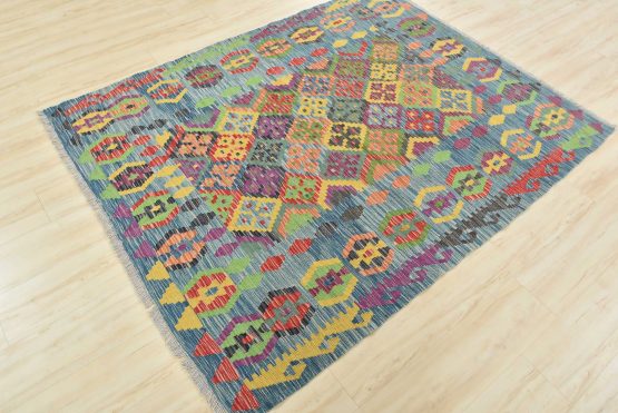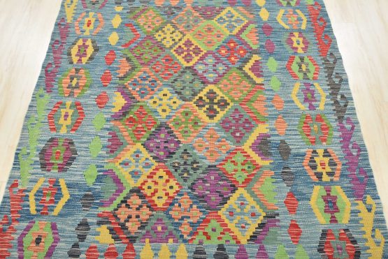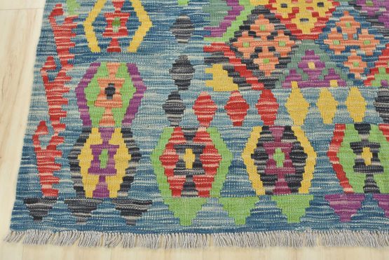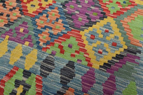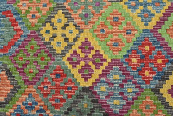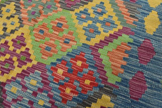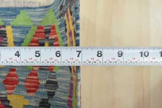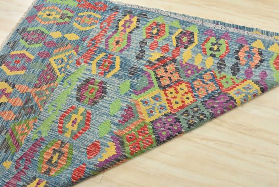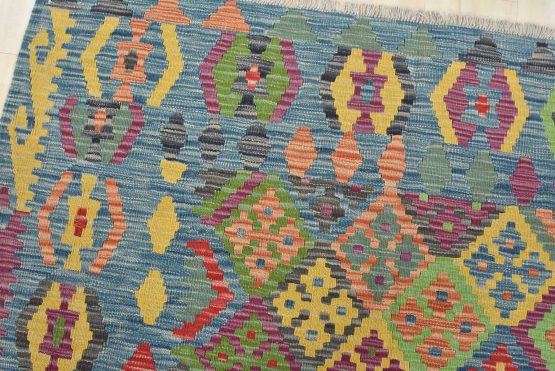 A tribal Kilim rug handwoven entirely from wool on a wool foundation. This oriental rug features an all-over geometric pattern in multiple colors. It is new and in excellent condition.