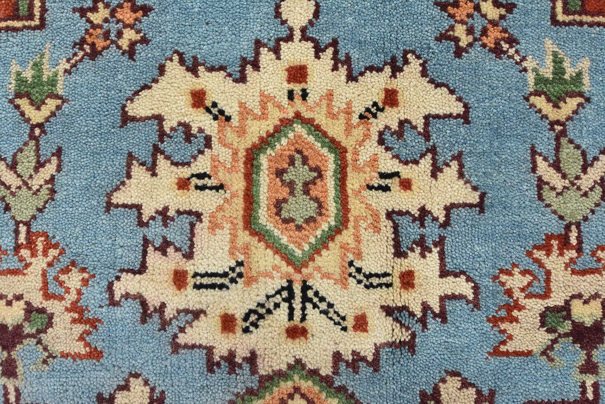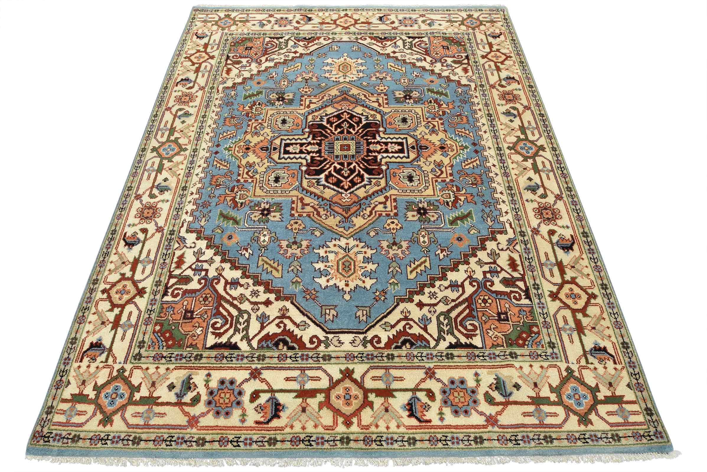 A traditional tribal Heriz rug hand-knotted with an all-wool pile on a cotton foundation. This oriental rug features a large central medallion surrounded by a geometric botanical design set against a light blue background. It is new and in excellent condition.