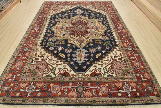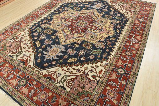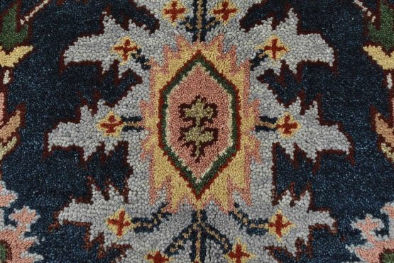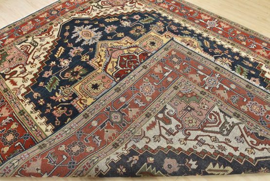A traditional tribal Heriz rug hand-knotted with an all-wool pile on a cotton foundation. This oriental rug features a large central medallion surrounded by a geometric floral design set against a dark blue background. It is new and in excellent condition.