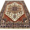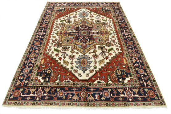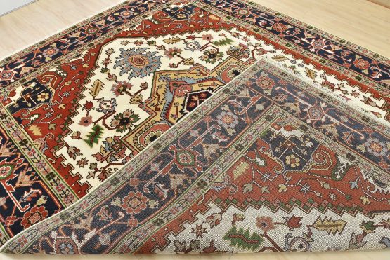 A traditional tribal Heriz rug hand-knotted with an all-wool pile on a cotton foundation. This oriental rug features a large central medallion surrounded by a geometric botanical design set against an ivory background. It is new and in excellent condition.