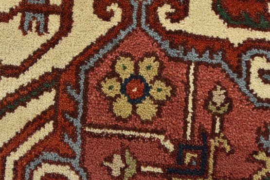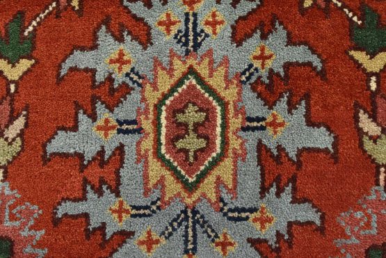 A traditional tribal Heriz rug hand-knotted with an all-wool pile on a cotton foundation. This oriental rug features a large central medallion surrounded by a geometric botanical design set against a red background. It is new and in excellent condition.