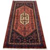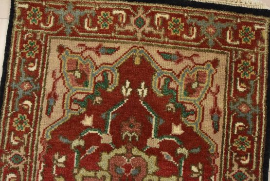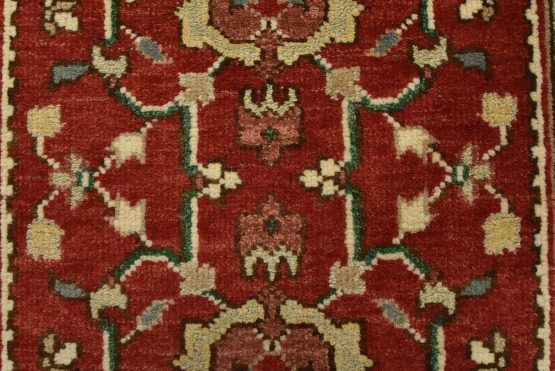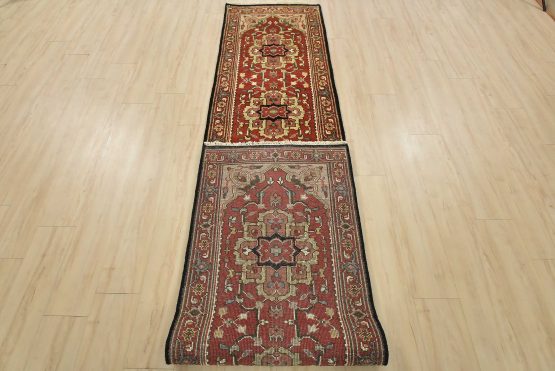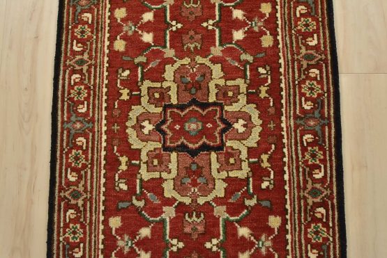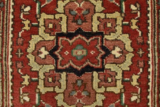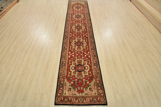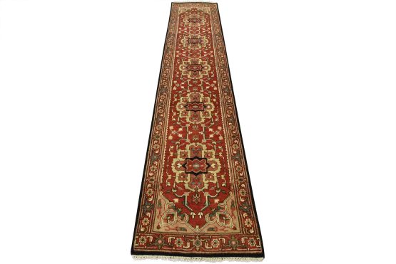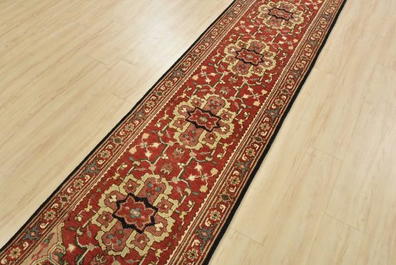 A traditional Heriz runner hand-knotted with an all-wool pile on a cotton foundation. This oriental rug features a row of medallions surrounded by botanical designs set against a red background. It is new and in excellent condition.