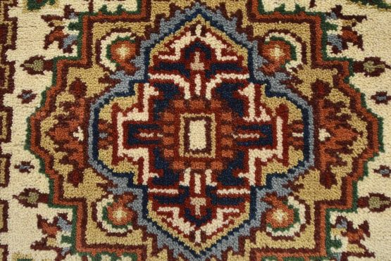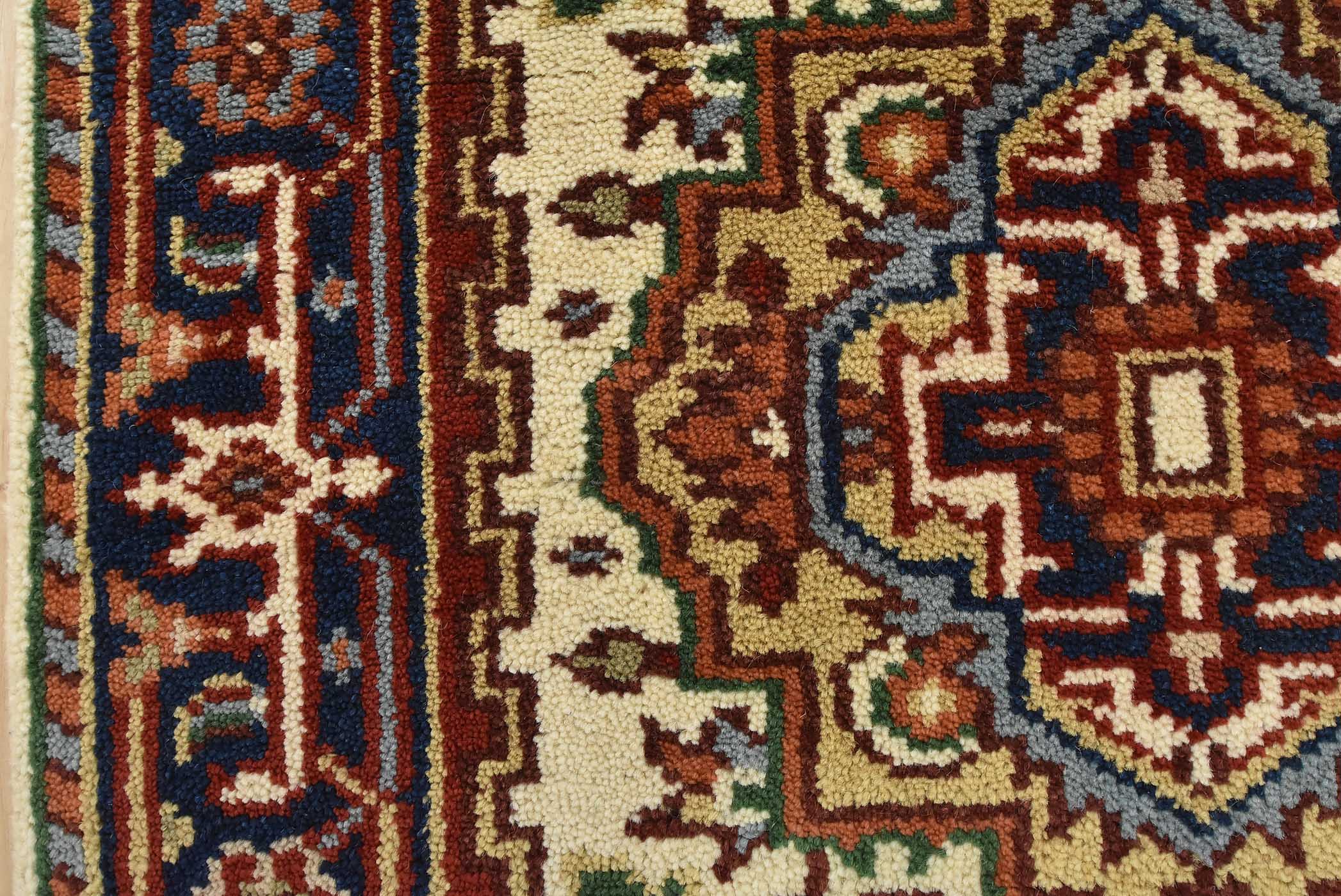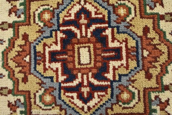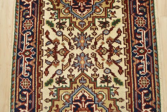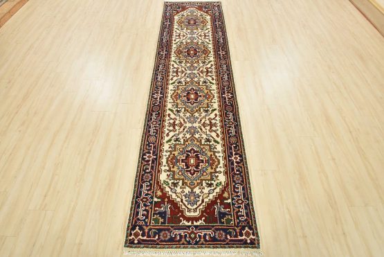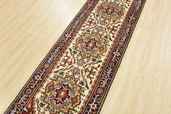 A traditional tribal Heriz runner hand-knotted with an all-wool pile on a cotton foundation. This oriental rug features a row of geometric medallions surrounded by a botanical design set against an ivory background. It is new and in excellent condition.