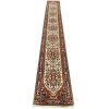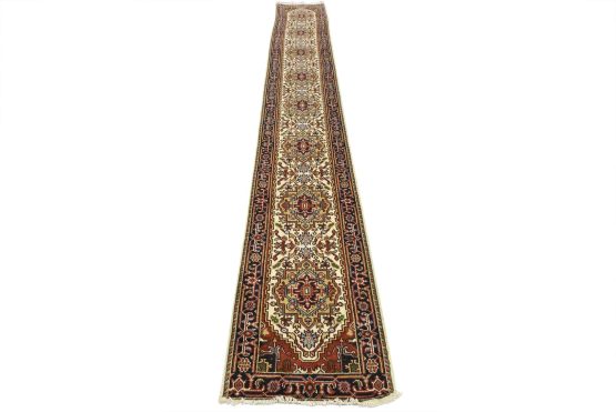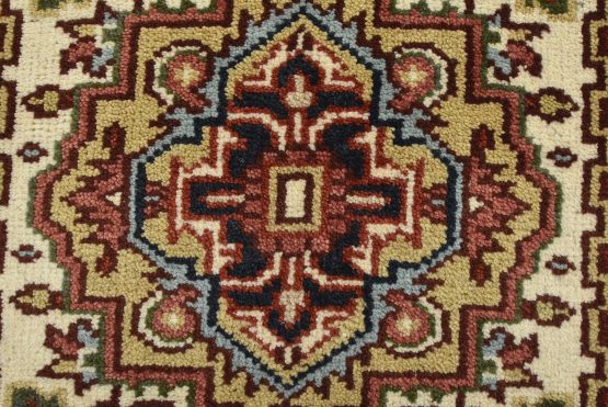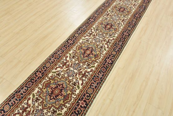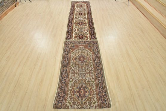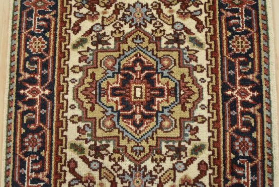 A traditional tribal Heriz runner hand-knotted with an all-wool pile on a cotton foundation. This oriental rug features a row of geometric medallions surrounded by a botanical design set against an ivory background. It is new and in excellent condition.