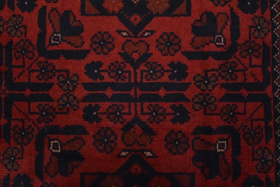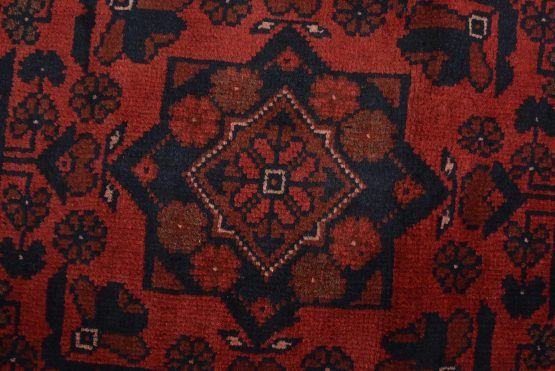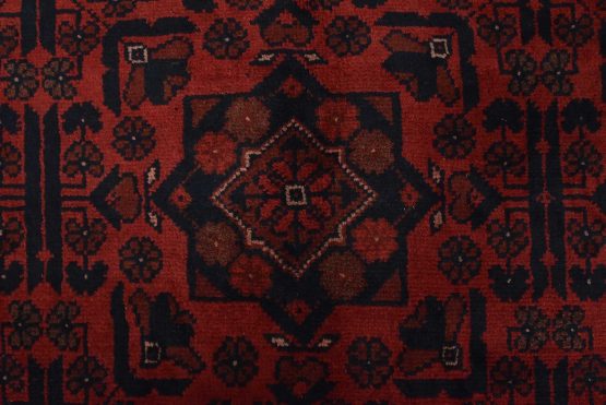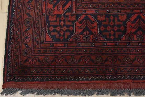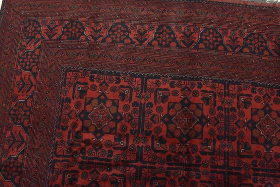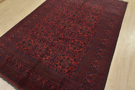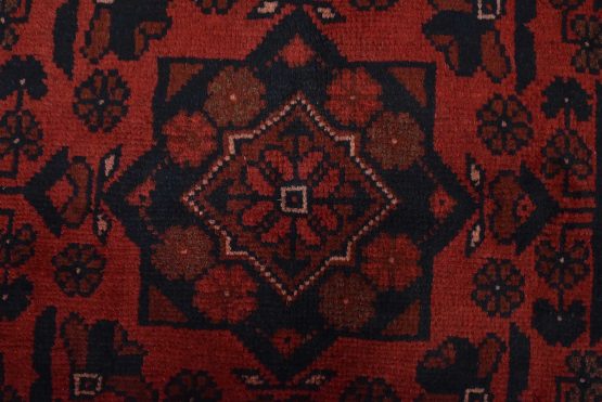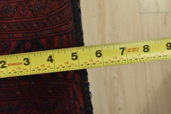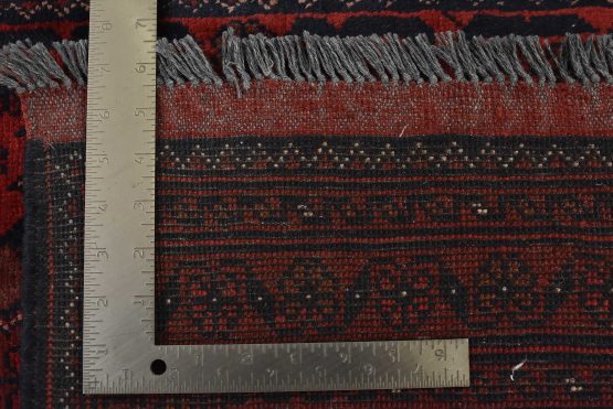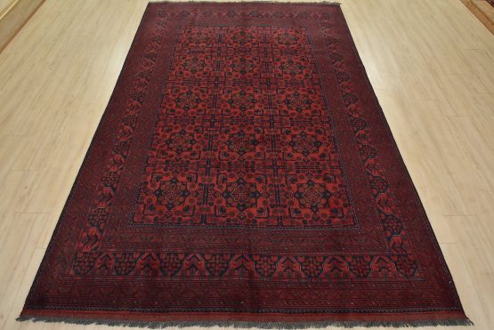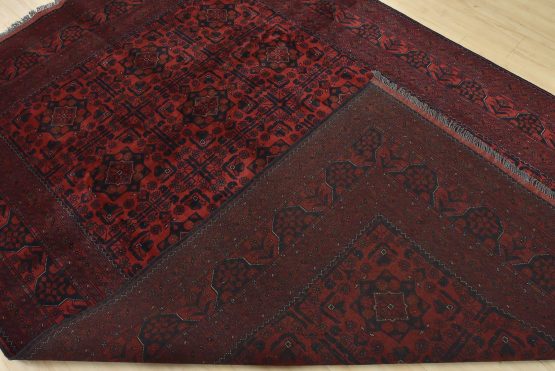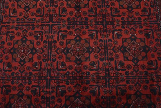 A tribal Turkmen rug hand-knotted with an all-wool pile on a wool foundation. This oriental rug features an all-over pattern of geometric medallions surrounded by small floral motifs set against a red background. It is new and in excellent condition.