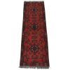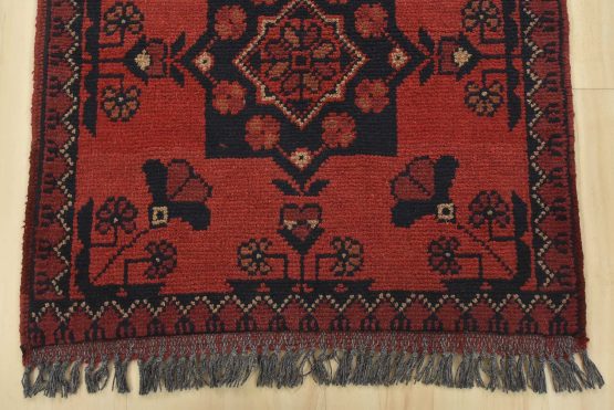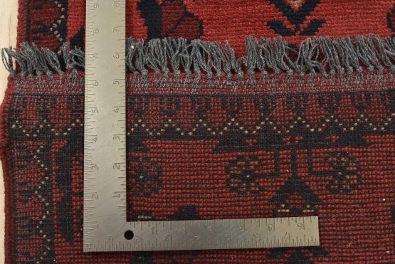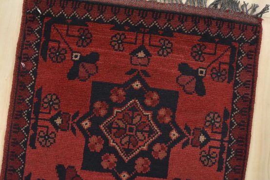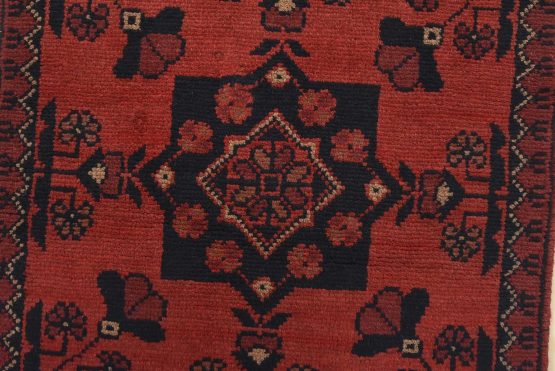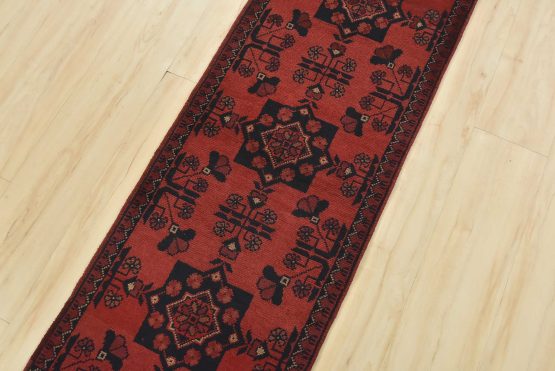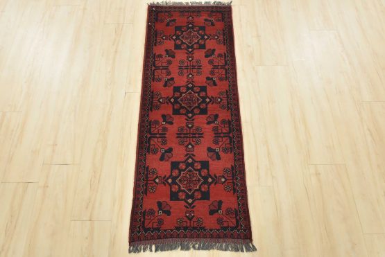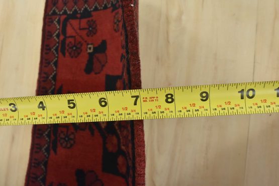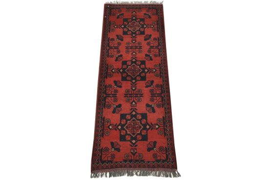 A tribal Turkmen runner hand-knotted with an all-wool pile on a wool foundation. This nomadic rug features geometric medallions surrounded by geometric floral motifs set against a red background. It is new and in excellent condition.