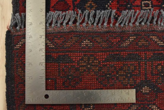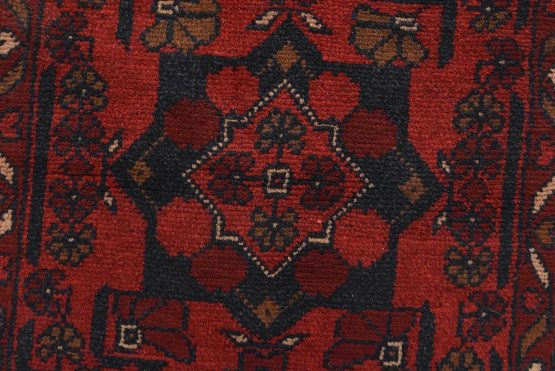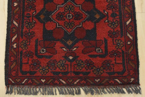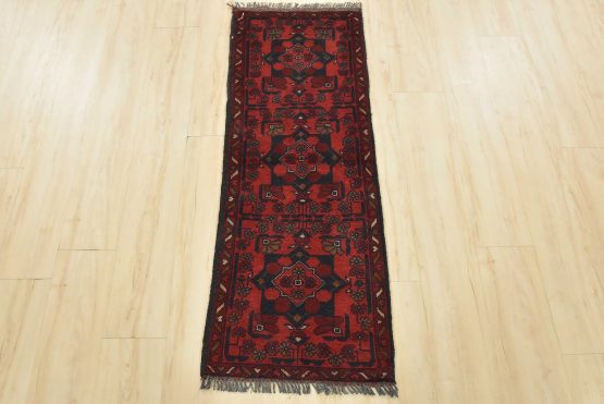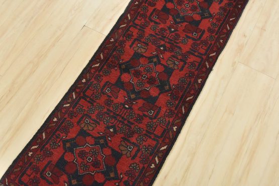A tribal Turkmen runner hand-knotted with an all-wool pile on a wool foundation. This nomadic oriental rug features geometric medallions surrounded by floral motifs set against a red background. It is new and in excellent condition.