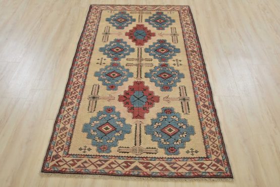 An authentic vintage tribal Milas rug hand-knotted with fine wool and natural dyes. This nomadic oriental rug features geometric motifs set against an ivory background. It has a full wool pile with no worn areas and is in very good condition.