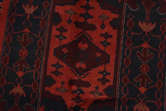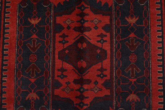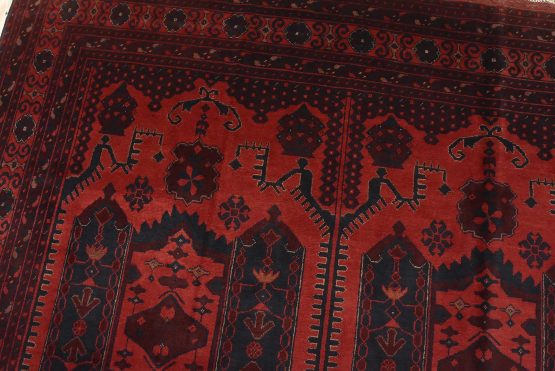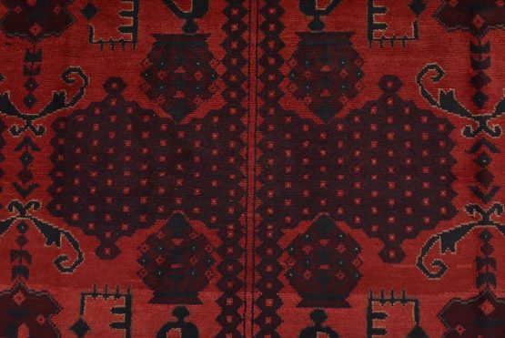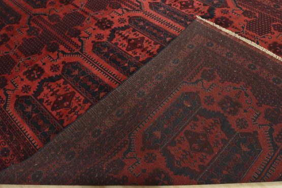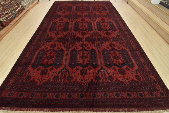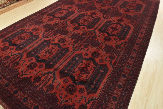 A traditional tribal Turkmen rug hand-knotted with an all-wool pile on a cotton foundation. This oriental rug features rows of geometric medallions set against a red background. It is new and in excellent condition.