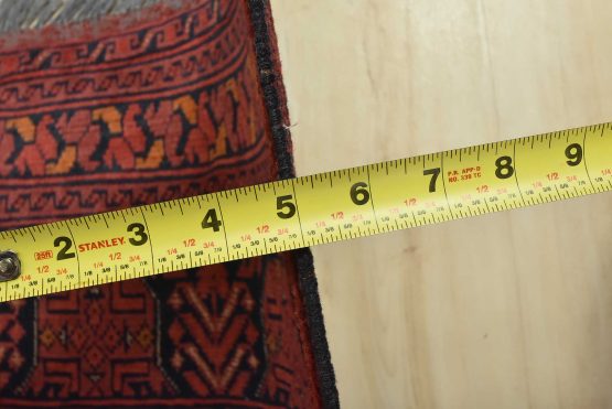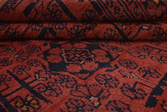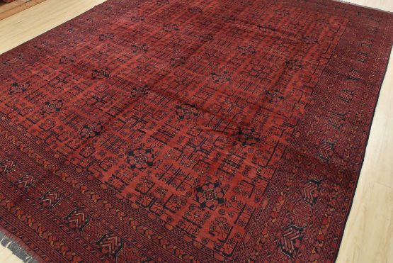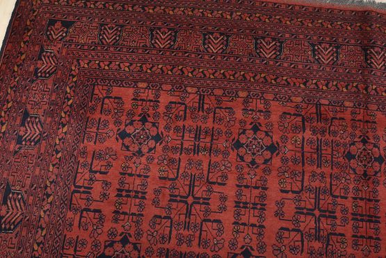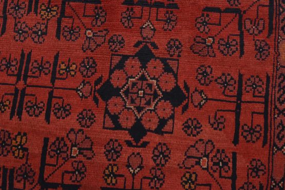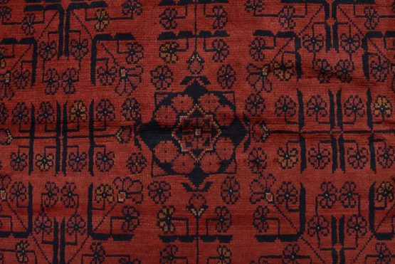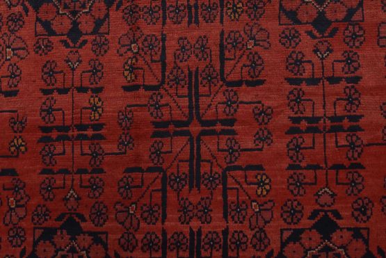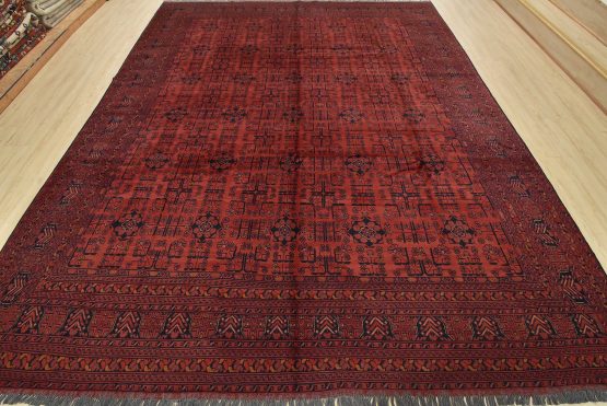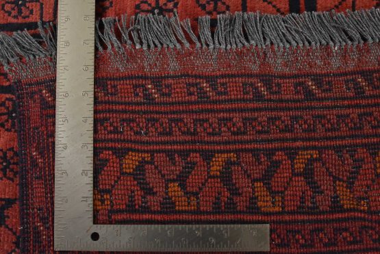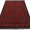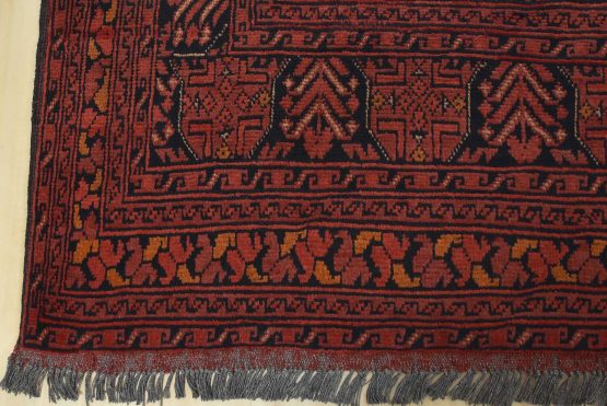 A traditional tribal Turkmen rug hand-knotted with an all-wool pile on a cotton foundation. This oriental rug features rows of geometric medallions surrounded by small floral designs set against a red background. It is new and in excellent condition.
