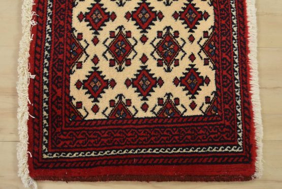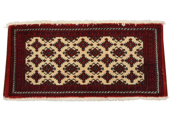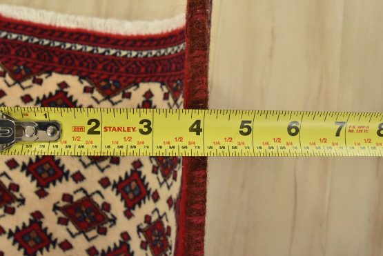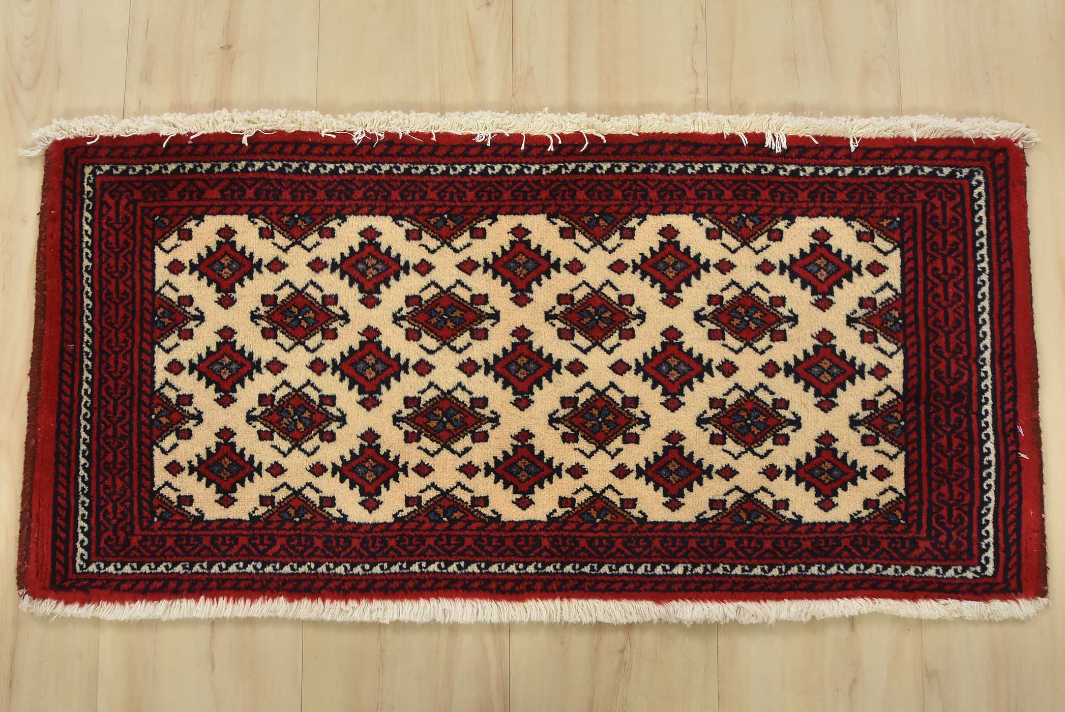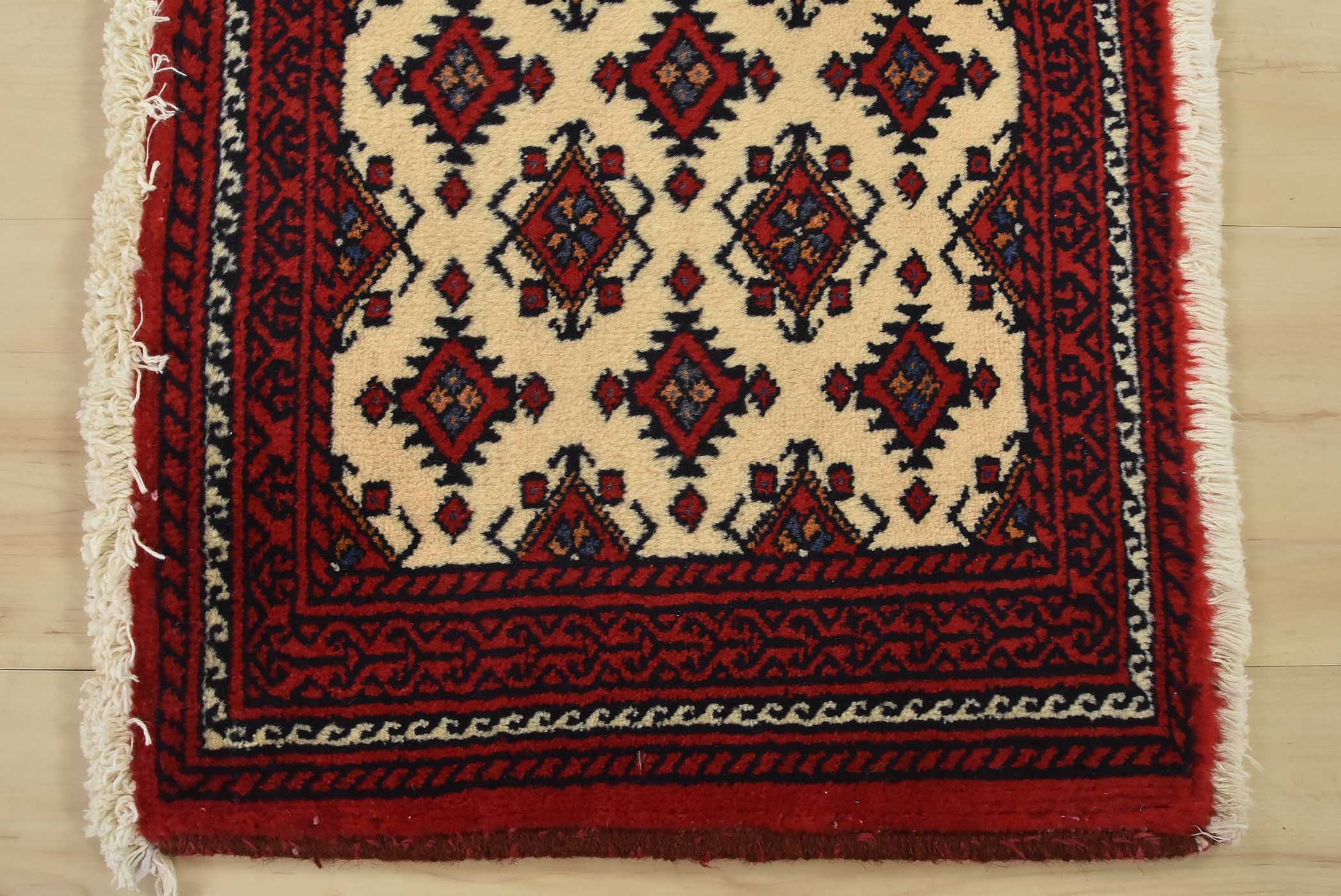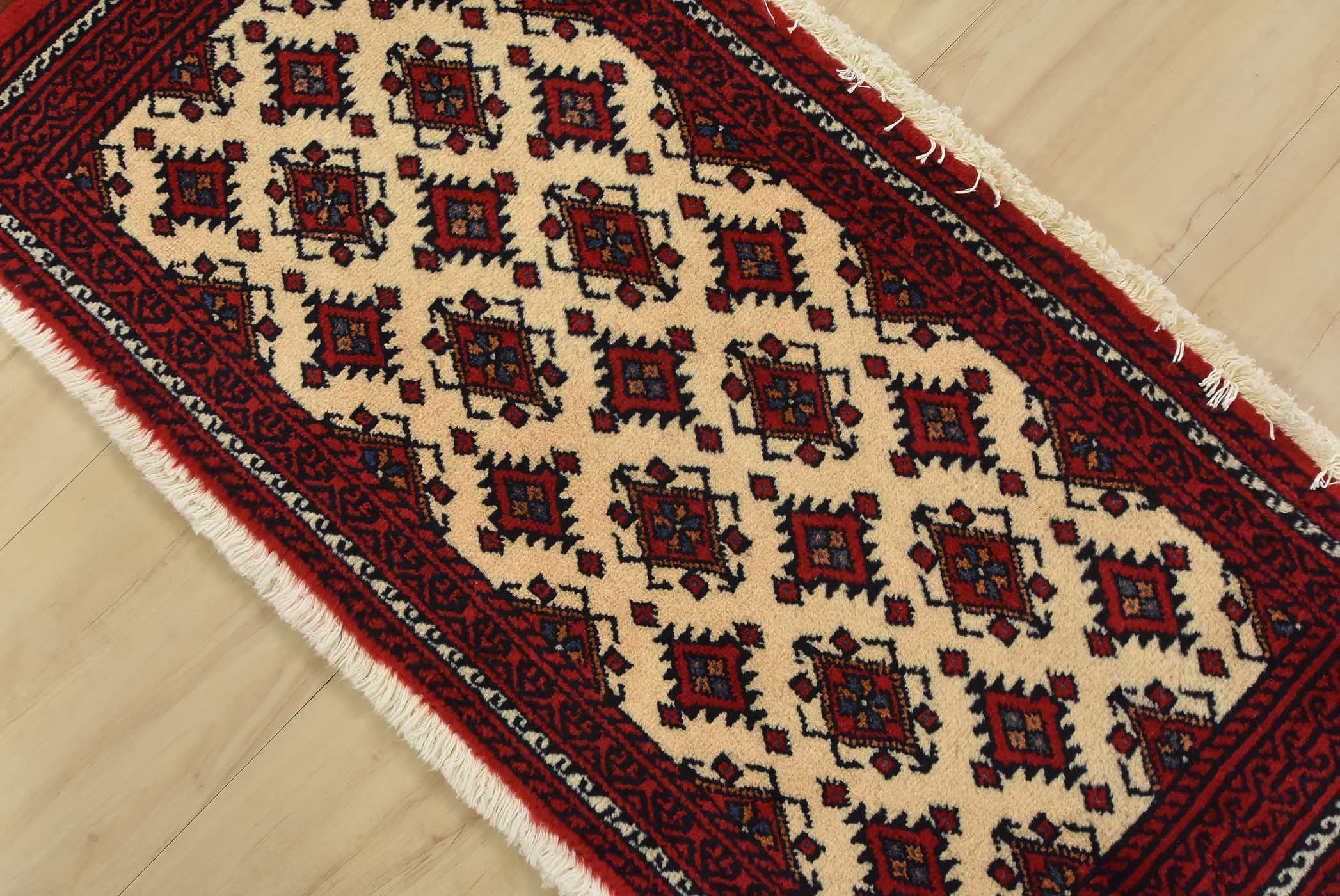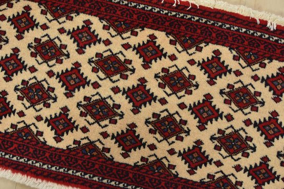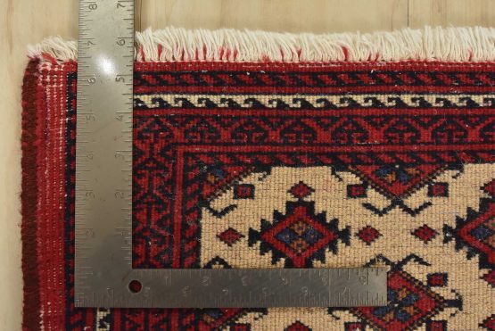 An authentic vintage tribal Turkmen rug hand-knotted with fine wool and natural dyes. This rug features geometric motifs set against an ivory background. It has a full wool pile with no worn areas and is in very good condition.