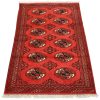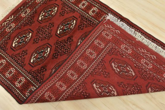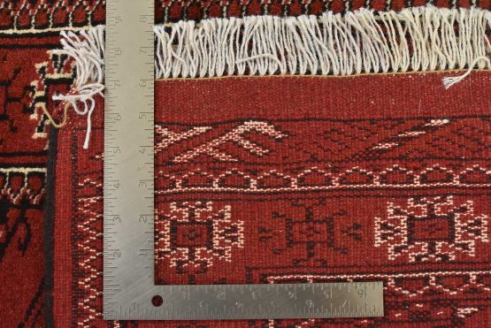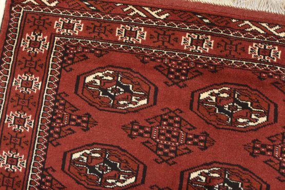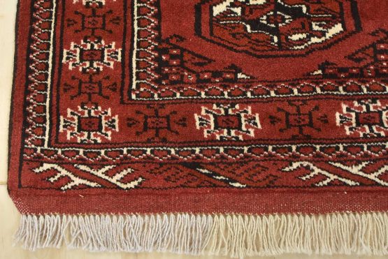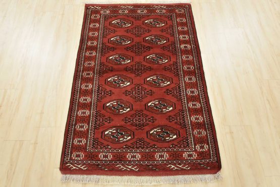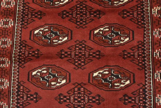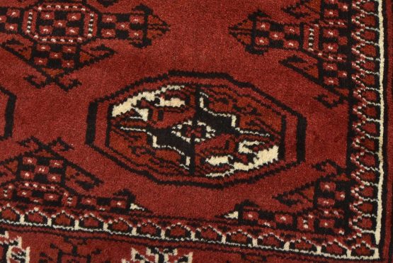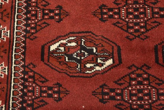 An authentic vintage tribal Turkmen rug hand-knotted with fine wool and natural dyes. This nomadic oriental rug features rows of geometric medallions set against a red background. It has a full wool pile with no worn areas and is in very good condition.