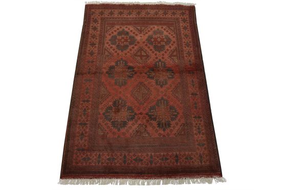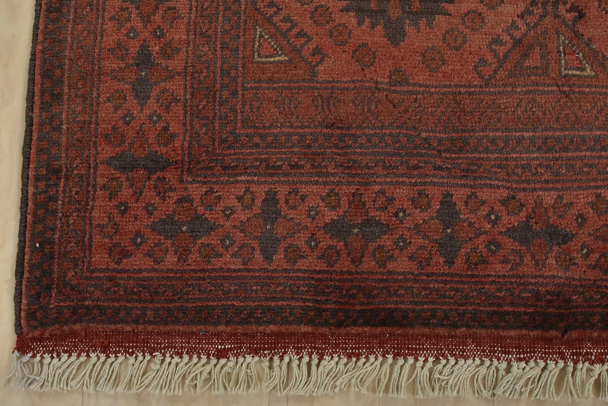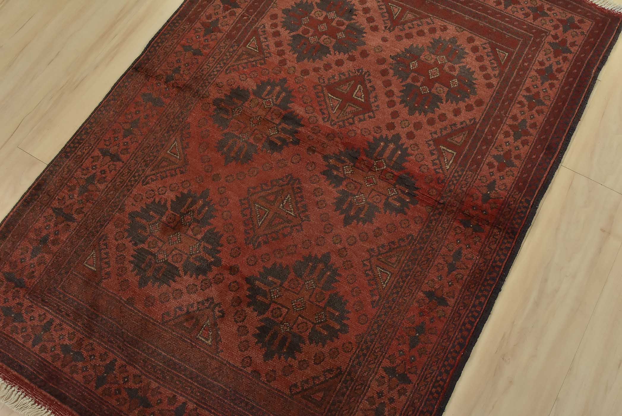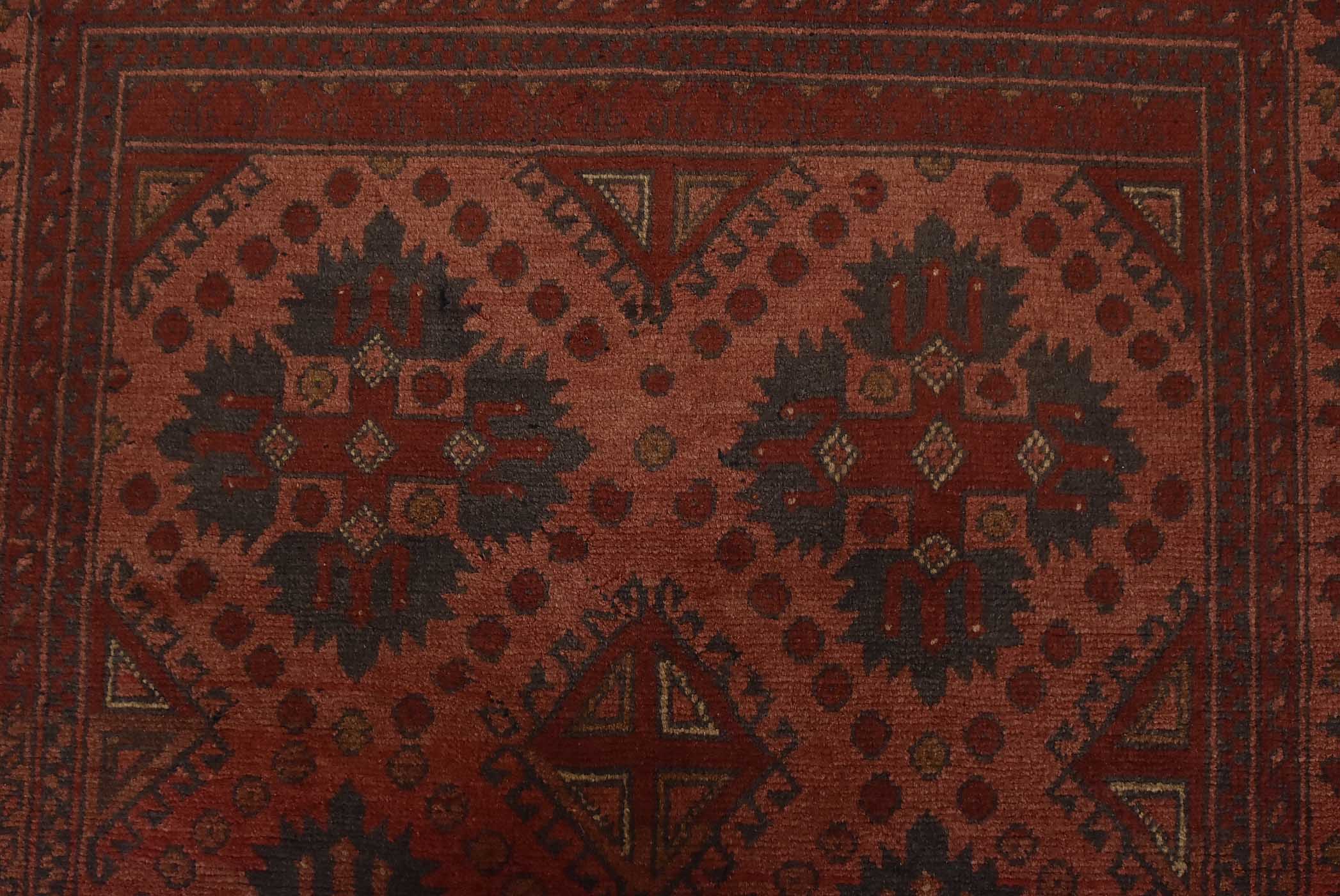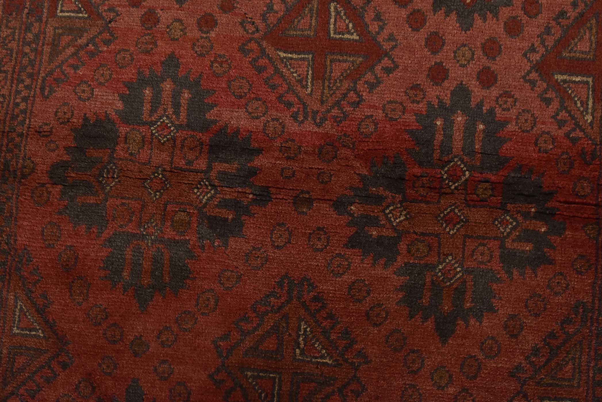 A tribal Turkmen rug hand-knotted with fine wool on a cotton foundation. This rug features geometric motifs set against a red background. It is new and in excellent condition.