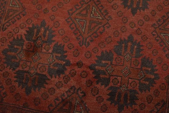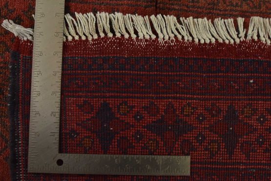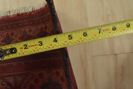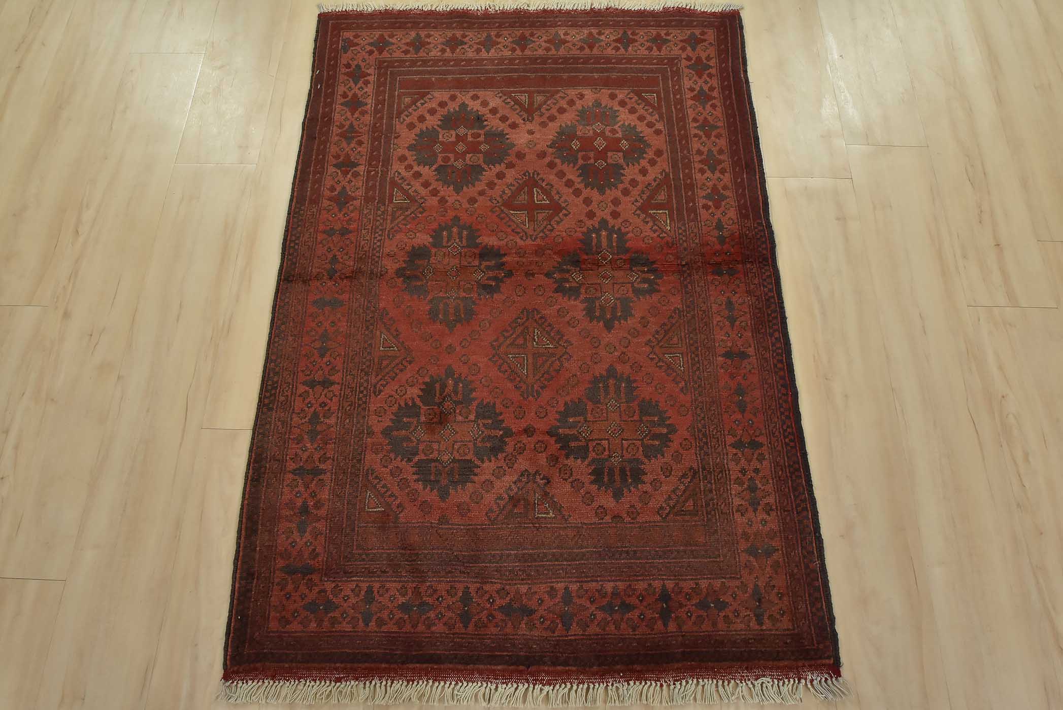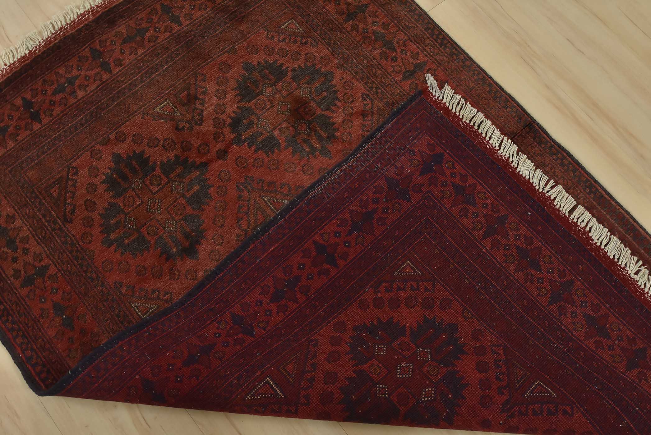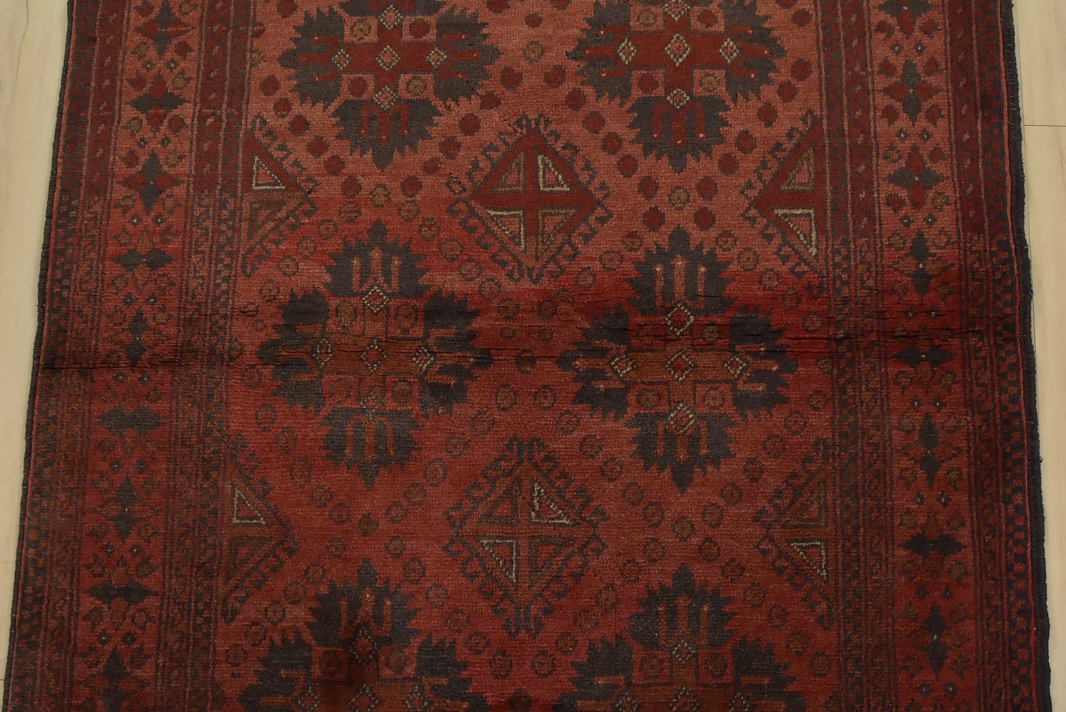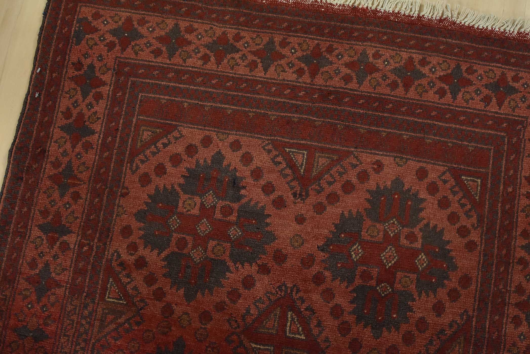 A tribal Turkmen rug hand-knotted with fine wool on a cotton foundation. This rug features geometric motifs set against a red background. It is new and in excellent condition.
