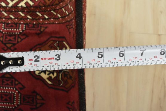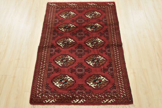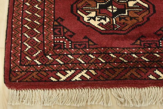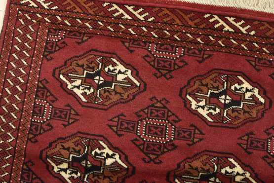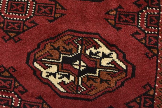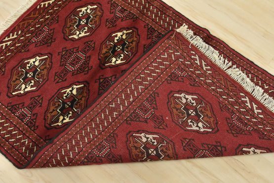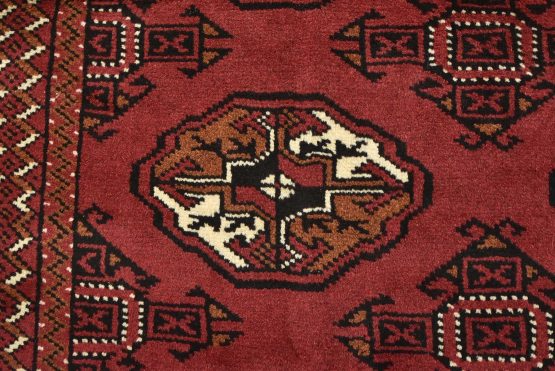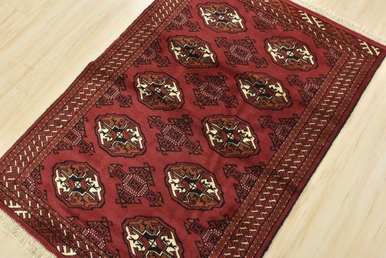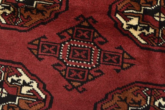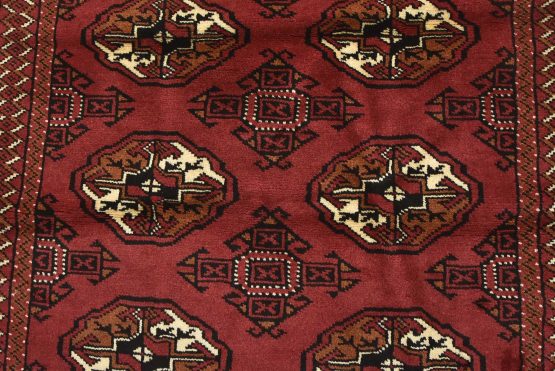 An authentic vintage tribal Turkmen rug hand-knotted with fine wool and natural dyes. This nomadic oriental rug features rows of geometric medallions set against a red background. It has a full wool pile with no worn areas and is in very good condition.