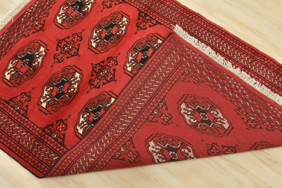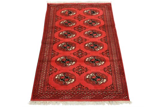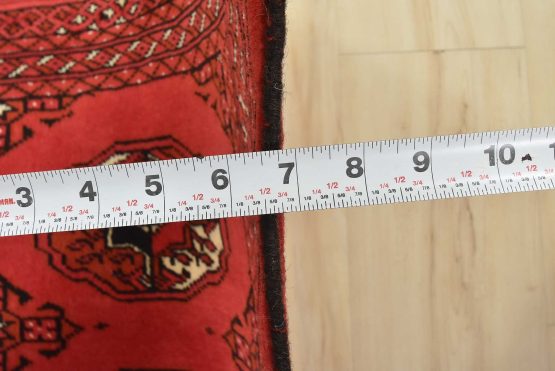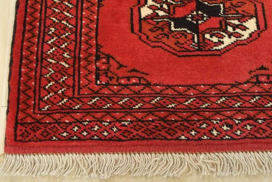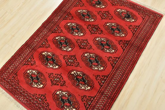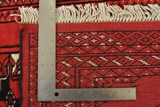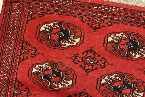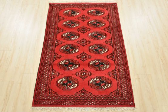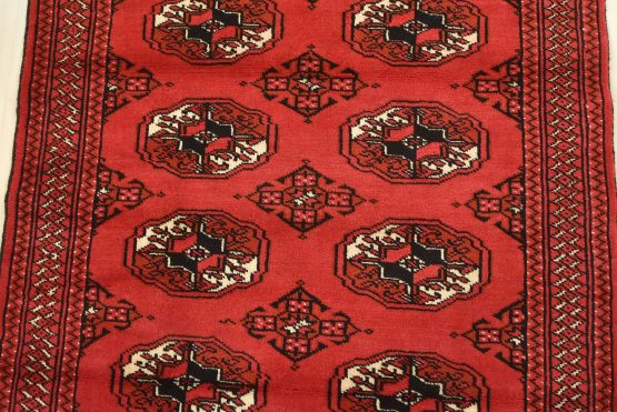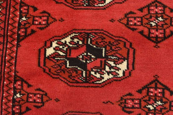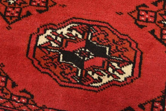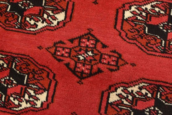 An authentic vintage tribal Turkmen rug hand-knotted with fine wool and natural dyes. This nomadic oriental rug features rows of geometric medallions set against a red background. It has a full wool pile with no worn areas and is in very good condition.