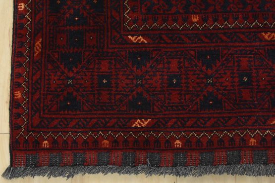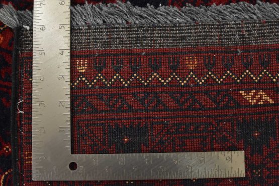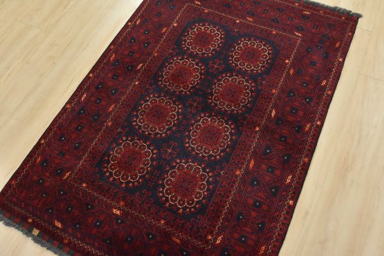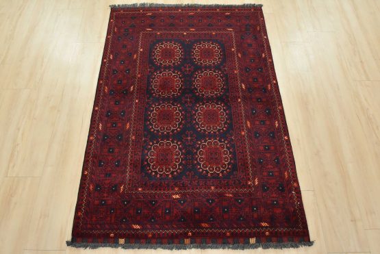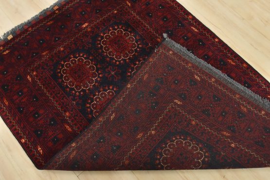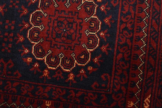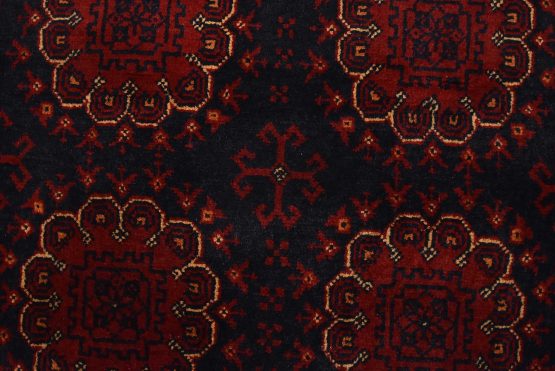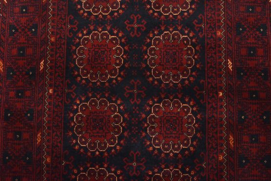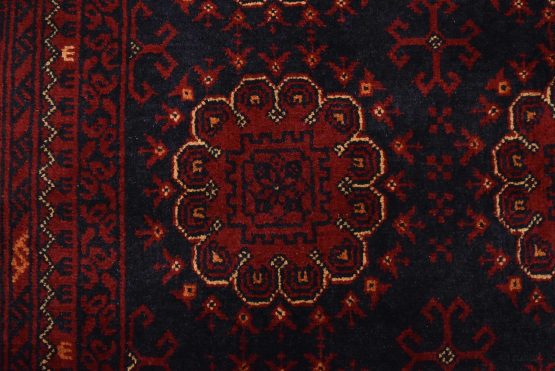 A tribal Turkmen rug hand-knotted with an all-wool pile on a wool foundation. This oriental rug features rows of medallions set against a dark blue background. It is new and in excellent condition.
