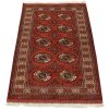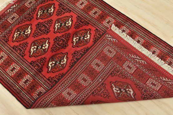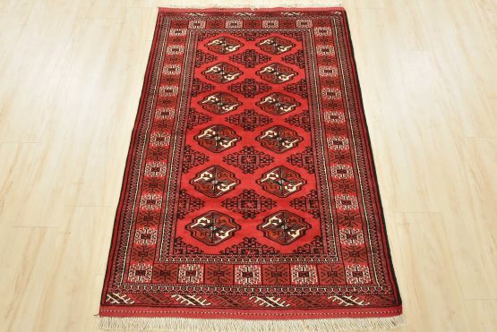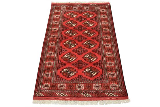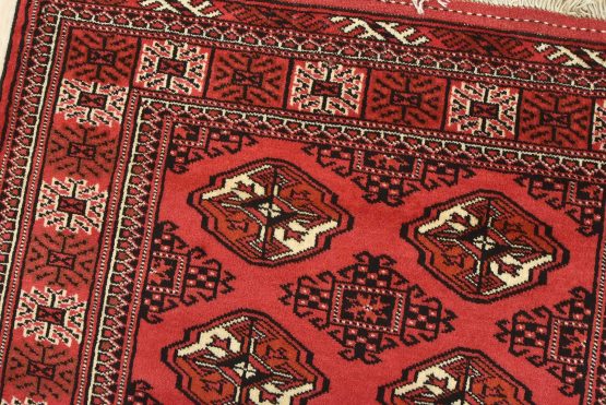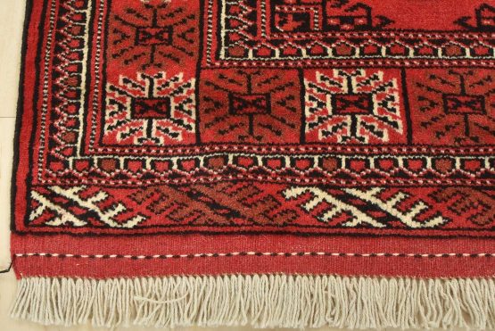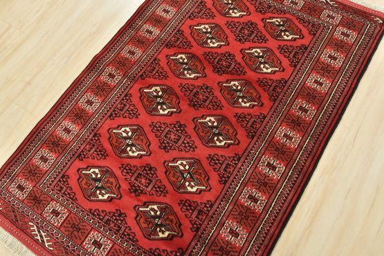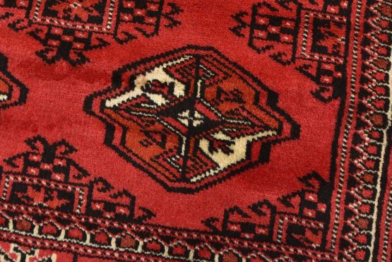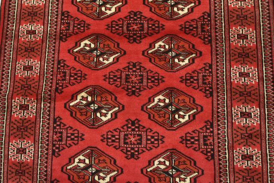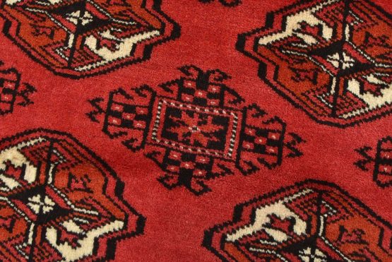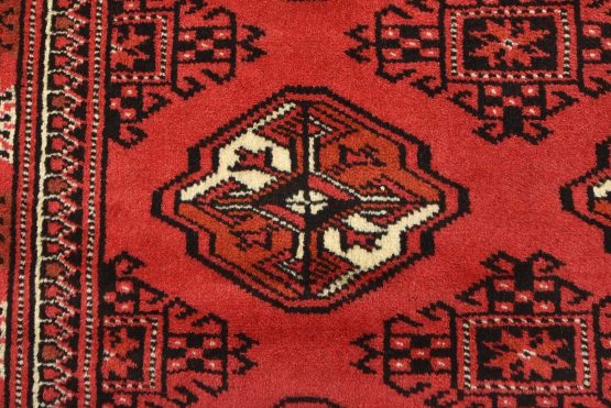 An authentic vintage tribal Turkmen rug hand-knotted with fine wool and natural dyes. This nomadic oriental rug features rows of geometric medallions set against a red background. It has a full wool pile with no worn areas and is in very good condition.
