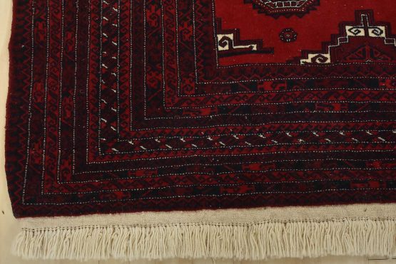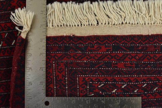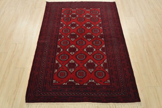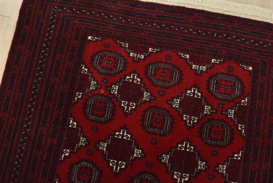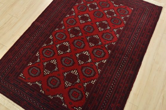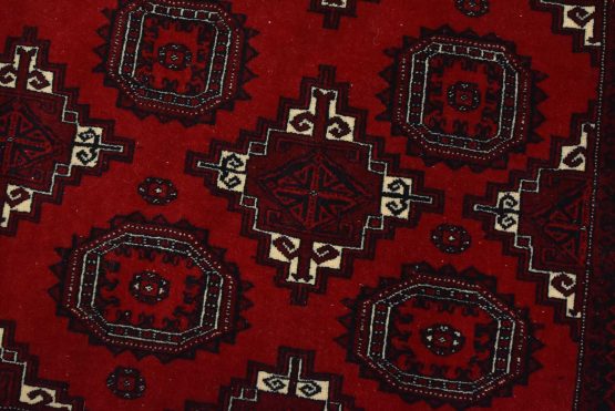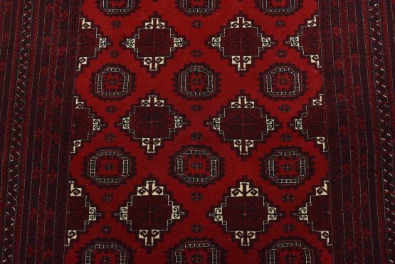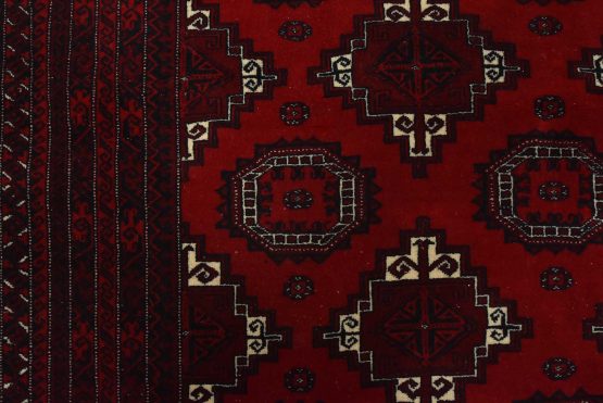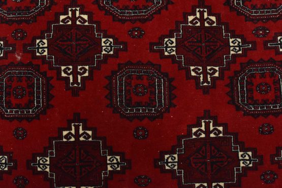 An authentic vintage tribal Turkmen rug hand-knotted with fine wool and natural dyes. This finely woven nomadic rug features rows of geometric motifs set against a red background. It has a full wool pile with no worn areas and is in very good condition.