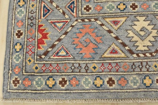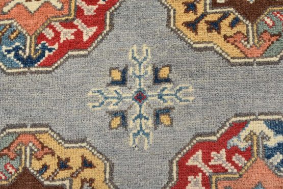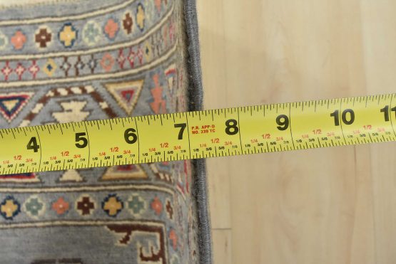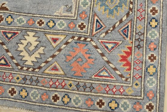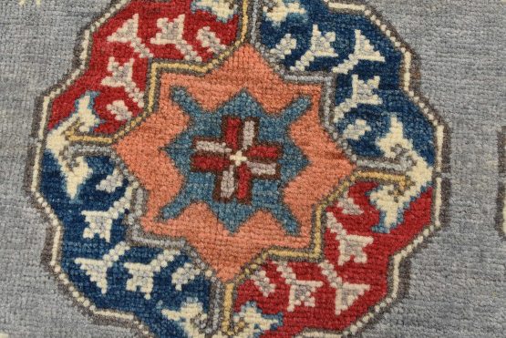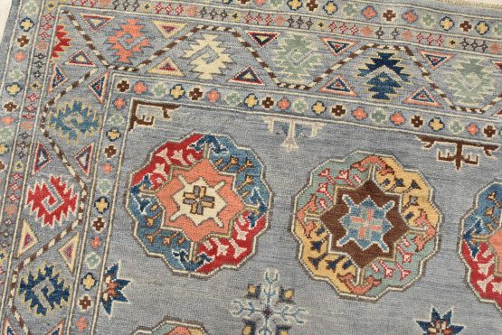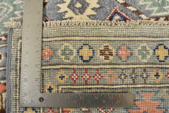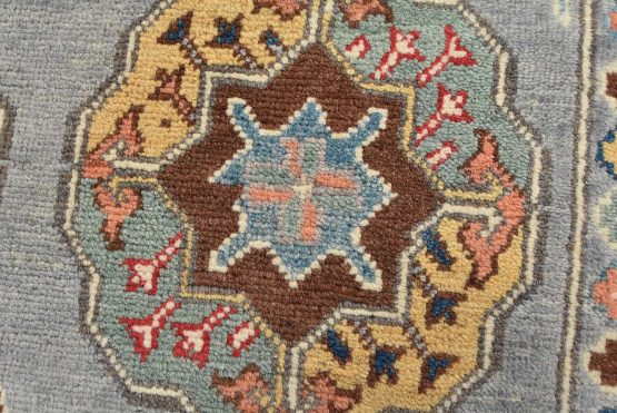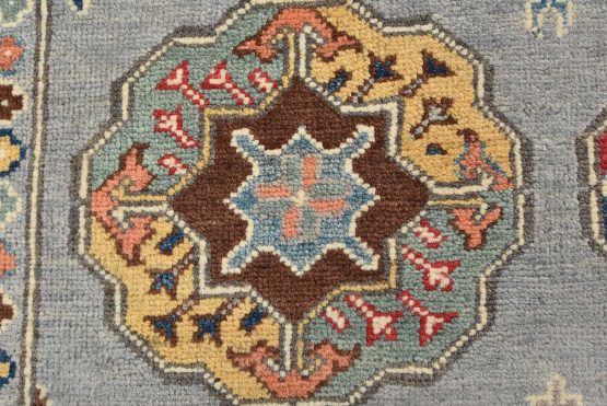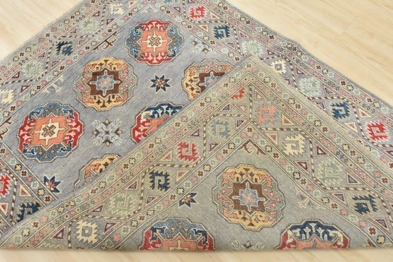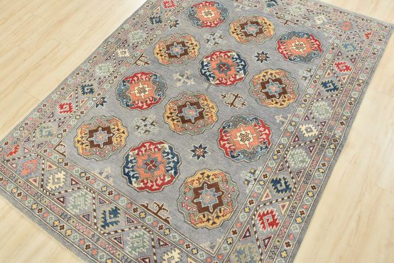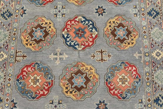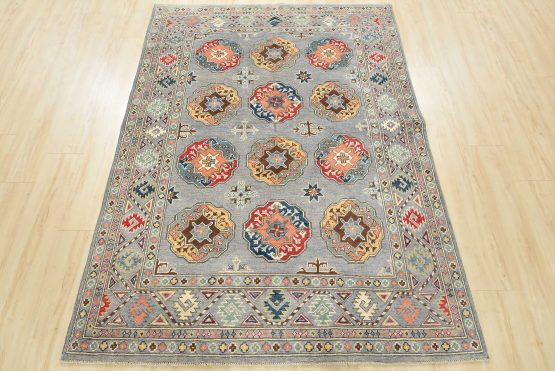 A tribal Turkmen rug hand-knotted with an all-wool pile on a cotton foundation. This oriental rug features rows of geometric medallions set against a gray background. It is new and in excellent condition.