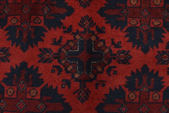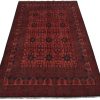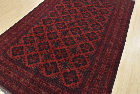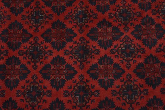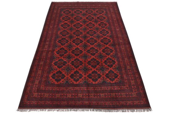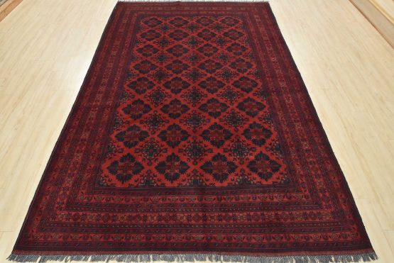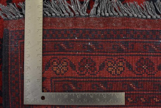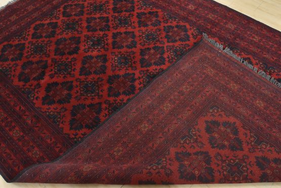 A tribal Turkmen rug hand-knotted with an all-wool pile on a wool foundation. This nomadic oriental rug features rows of geometric medallions set against a red background. It is new and in excellent condition.