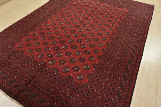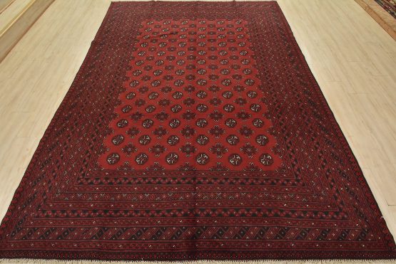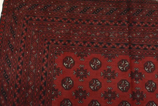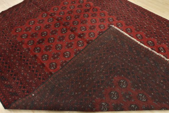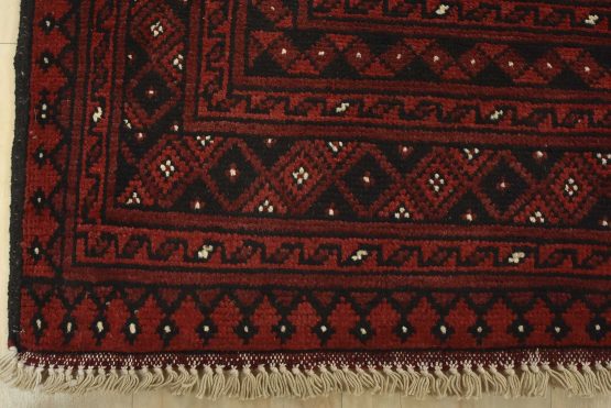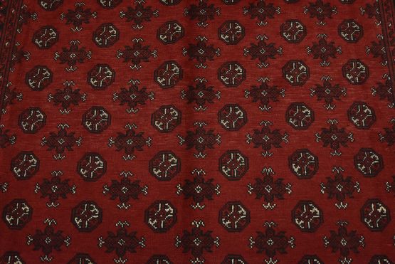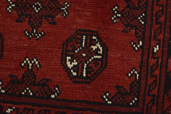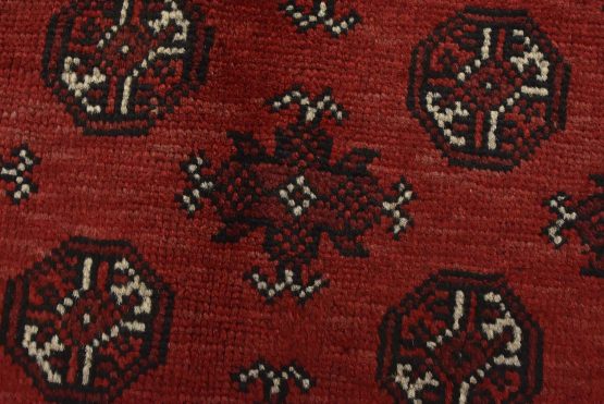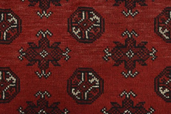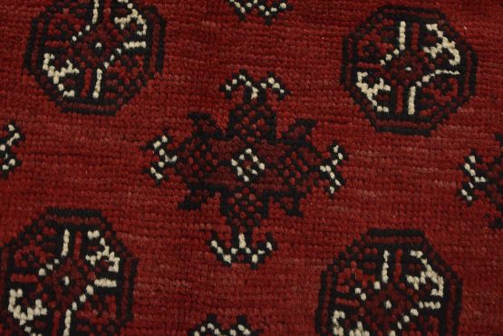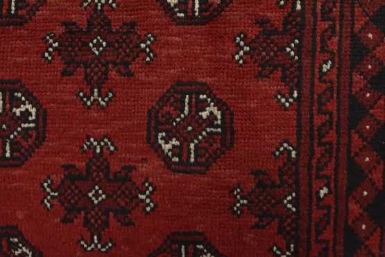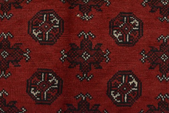 An authentic vintage tribal Turkmen rug hand-knotted with fine wool and natural dyes. This rug features small rows of geometric medallions set against a red background. It has a full wool pile with no worn areas and is in very good condition.