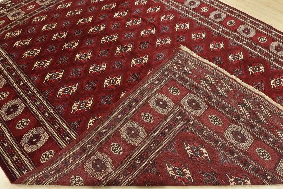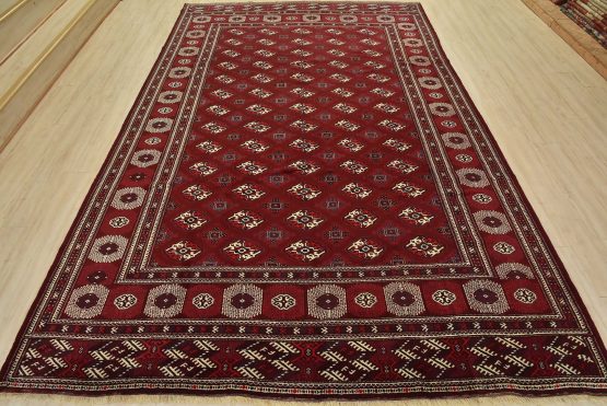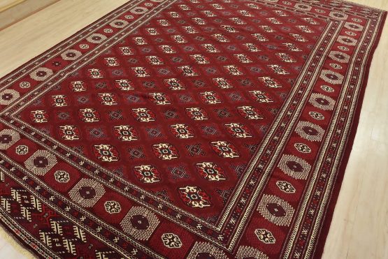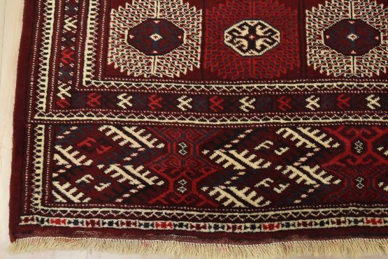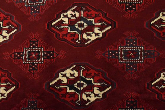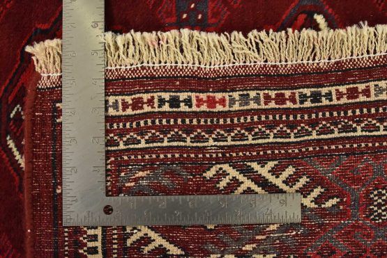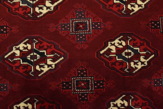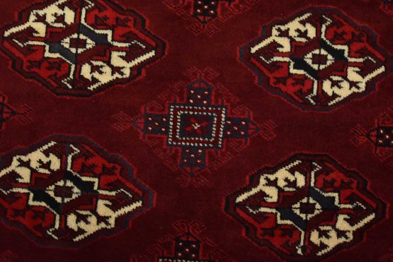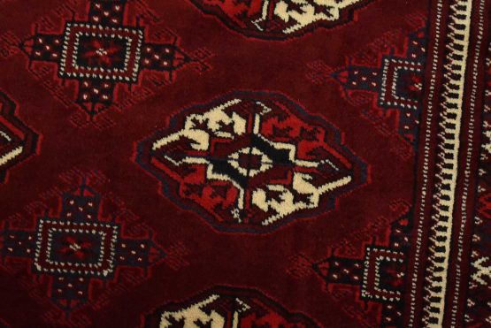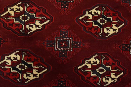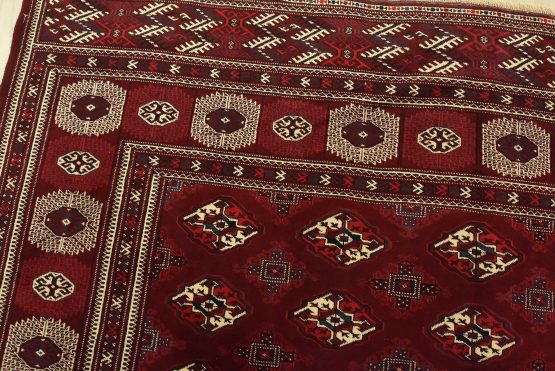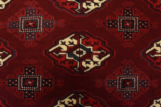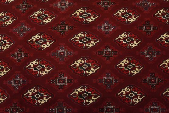 An authentic vintage tribal Turkmen rug hand-knotted with fine wool and natural dyes. This finely woven nomadic rug features rows of repeating geometric medallions set against a red background. It has a full wool pile with no worn areas and is in very good condition.