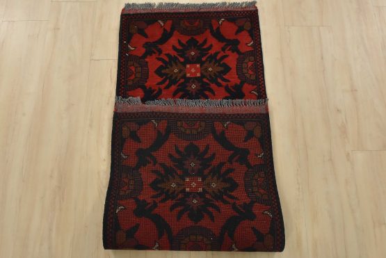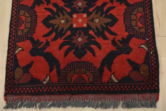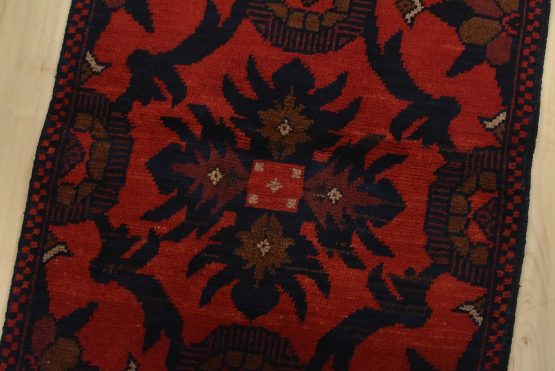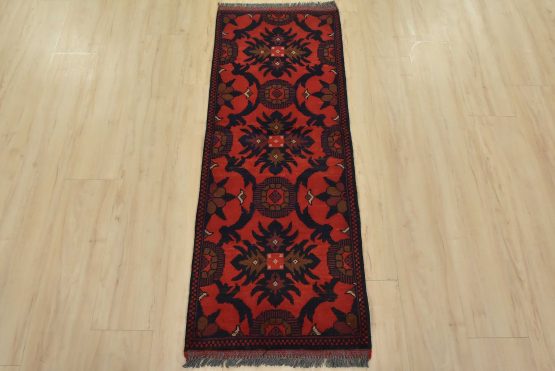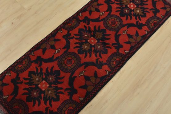 An authentic tribal Turkmen runner hand-knotted with an all-wool pile on a cotton foundation. This oriental rug features a row of medallions set against a red background. It is new and in excellent condition.