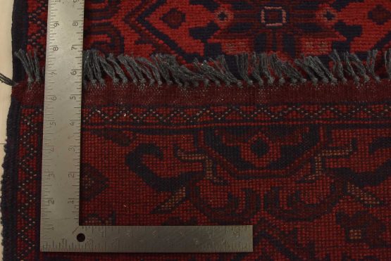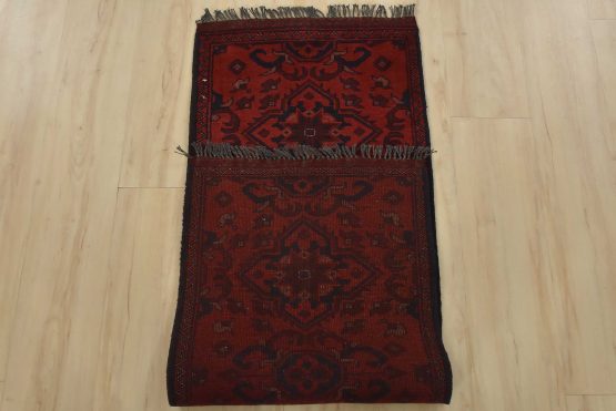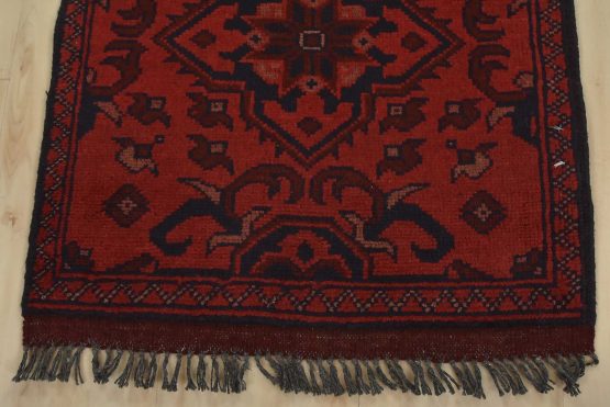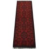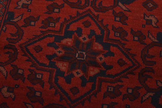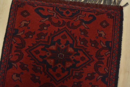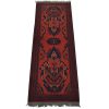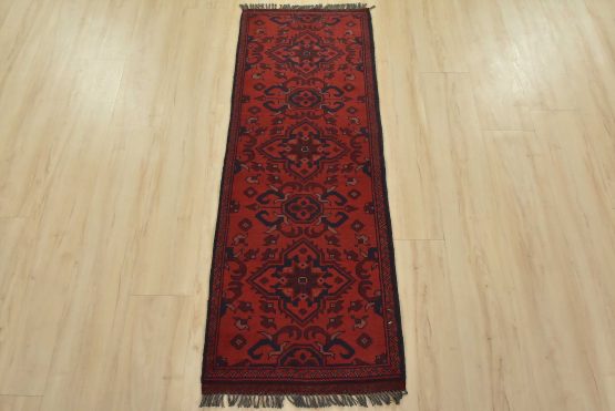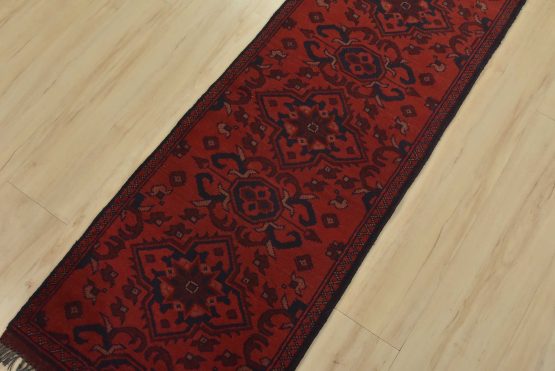 An authentic tribal Turkmen runner hand-knotted with an all-wool pile on a cotton foundation. This oriental rug features a row of geometric medallions set against a red background. It is new and in excellent condition.