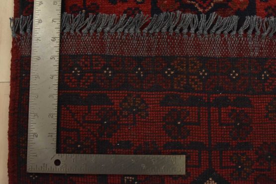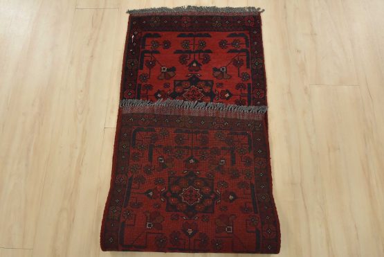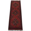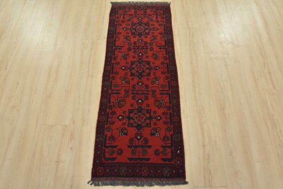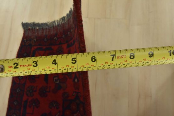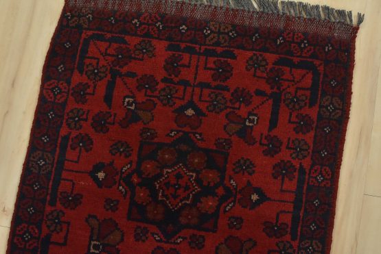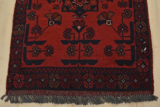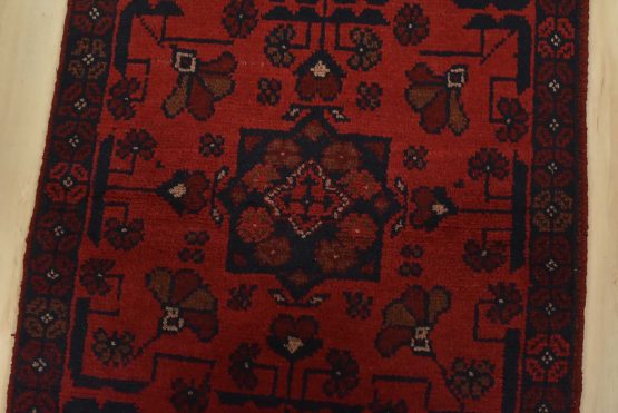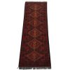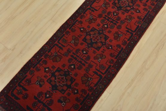 An authentic tribal Turkmen runner hand-knotted with an all-wool pile on a cotton foundation. This oriental rug features a row of geometric medallions surrounded by small flowers set against a red background. It is new and in excellent condition.
