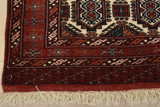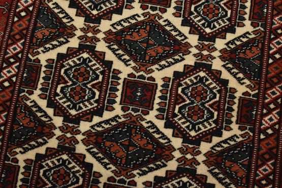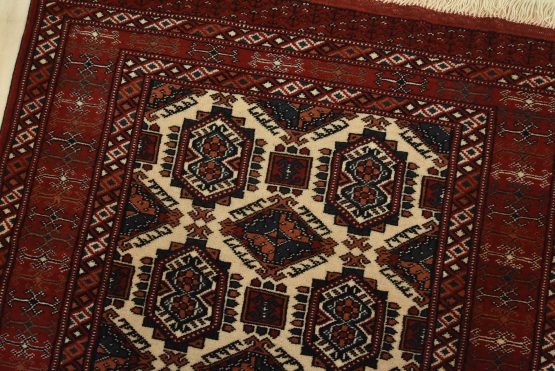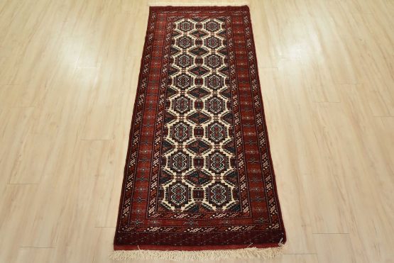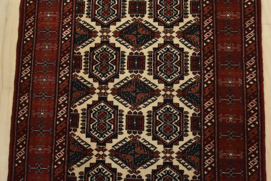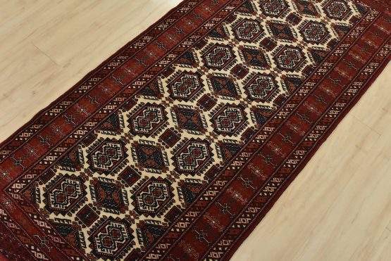 An authentic vintage tribal Turkmen runner hand-knotted with fine wool and natural dyes. This nomadic carpet features an all-over geometric pattern set against an ivory background. It has a full wool pile with no worn areas and is in very good condition.