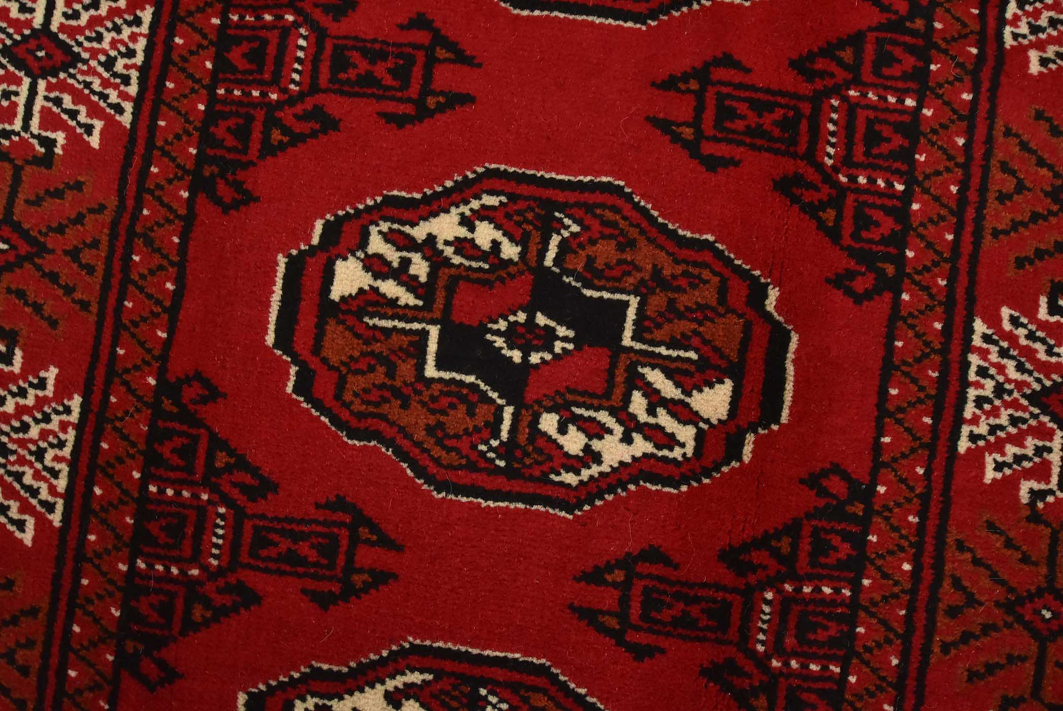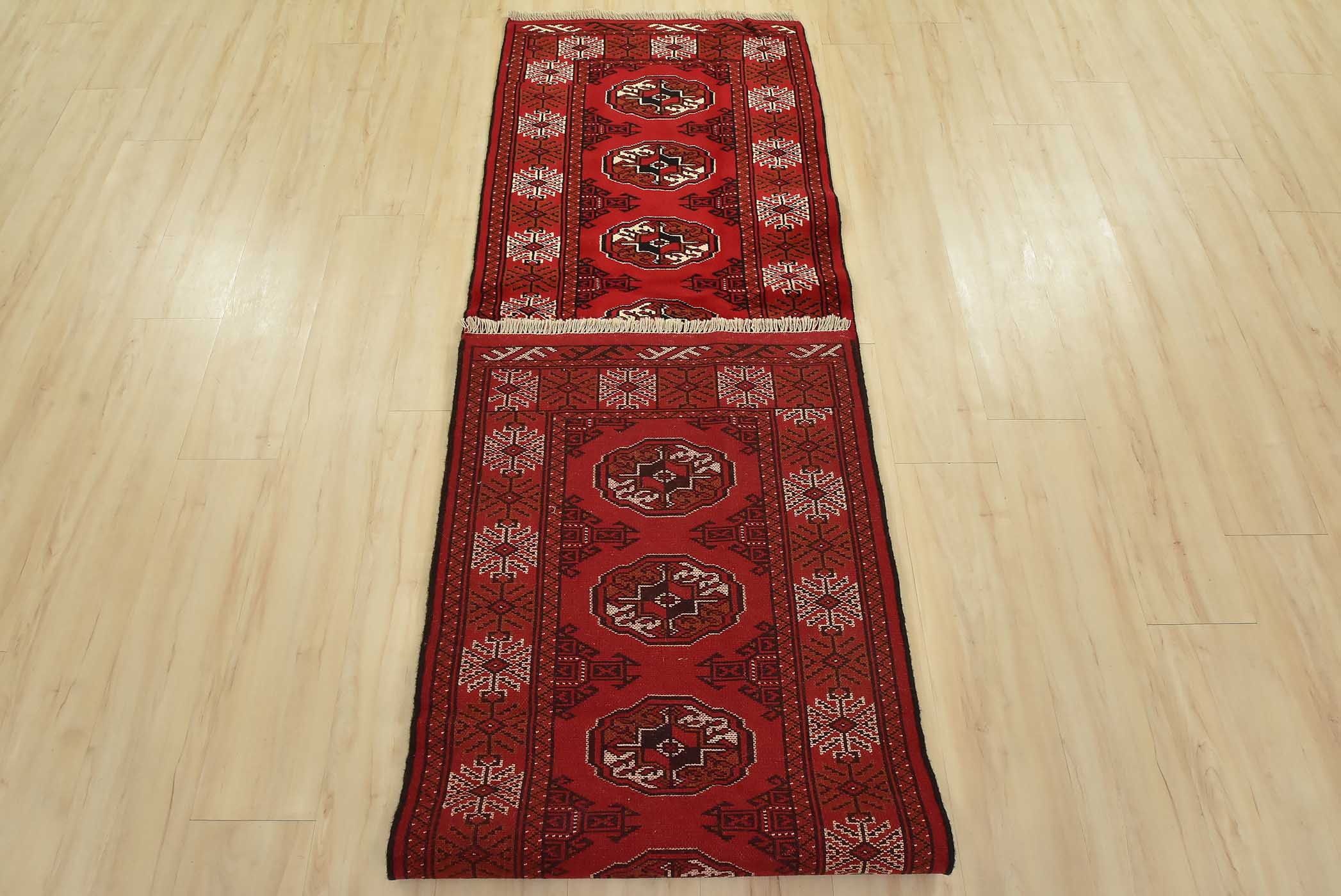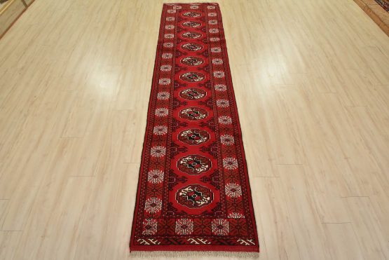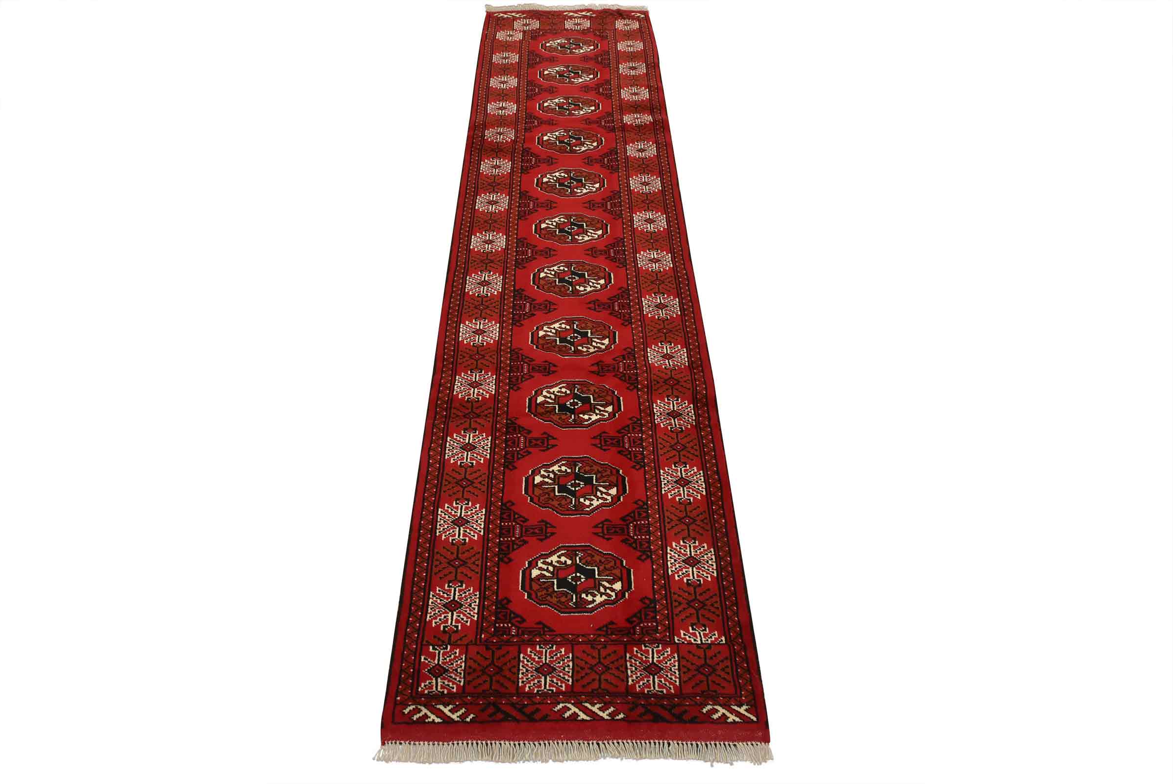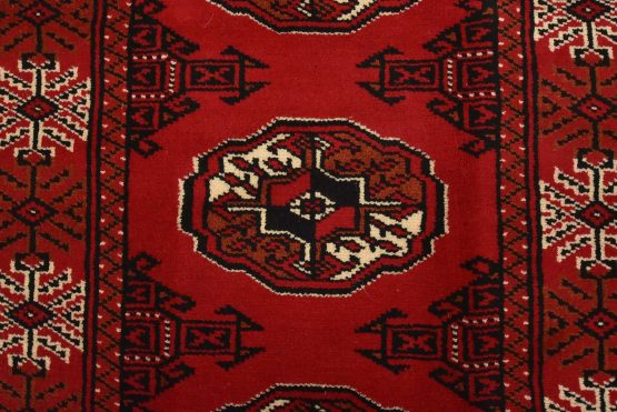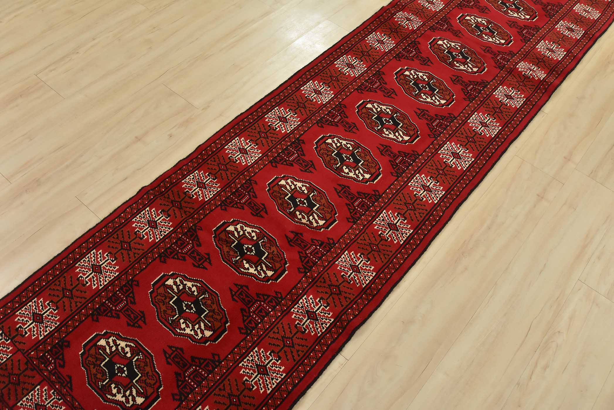 An authentic, vintage tribal Turkmen runner, hand-knotted with fine wool and natural dyes. This nomadic oriental rug features a row of repeating medallions set against a red background. It has a full wool pile with no worn areas and is in very good condition.